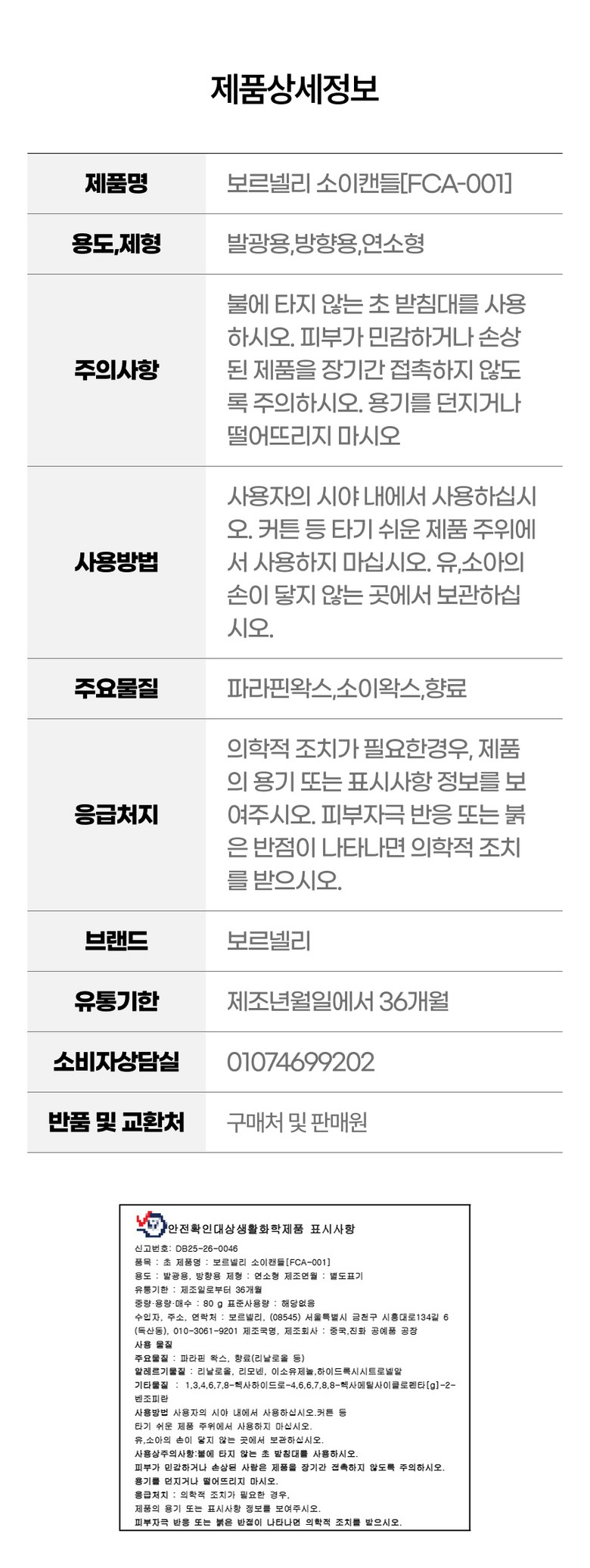 | 품목 및 제품명 | 보르넬리 소이캔들[FCA-001] | 용도(표백제의 경우 계열을 함께표시) 및 제형 | 발광용,방향용,연소형 |