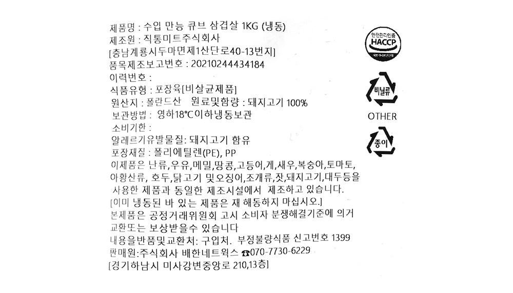 | 제조연월일, 소비기한 또는 품질유지기한 | 소비기한(또는 유통기한) : 2026년 12월 22일 이거나 그 이후인 상품 제조년월일 : 2025년 12월 23일 이후인 제조상품 | 세부 품목군별 표시사항 | 축산물 등급표시 : 해당 없음 / 이력번호 표시유무 : 이력번호 표시제품임 |