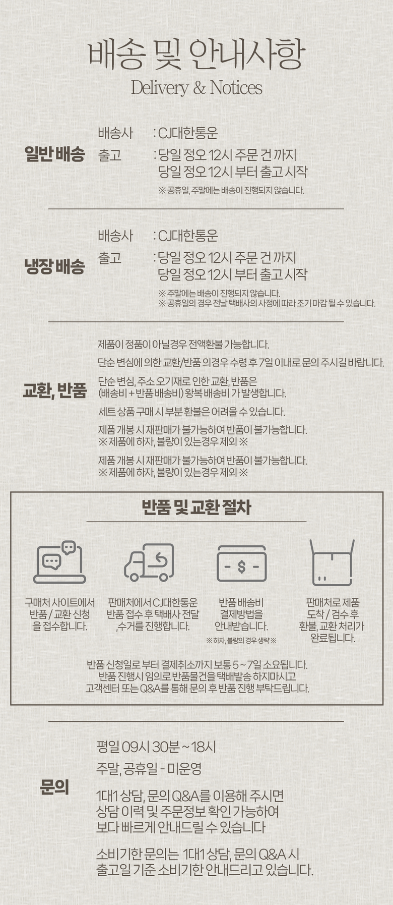 - ㆍ모니터 해상도의 차이로 인해 색상이나 이미지가 실제와 달라, 고객이 단순 변심으로 교환/반품을 무료로 요청하는 경우