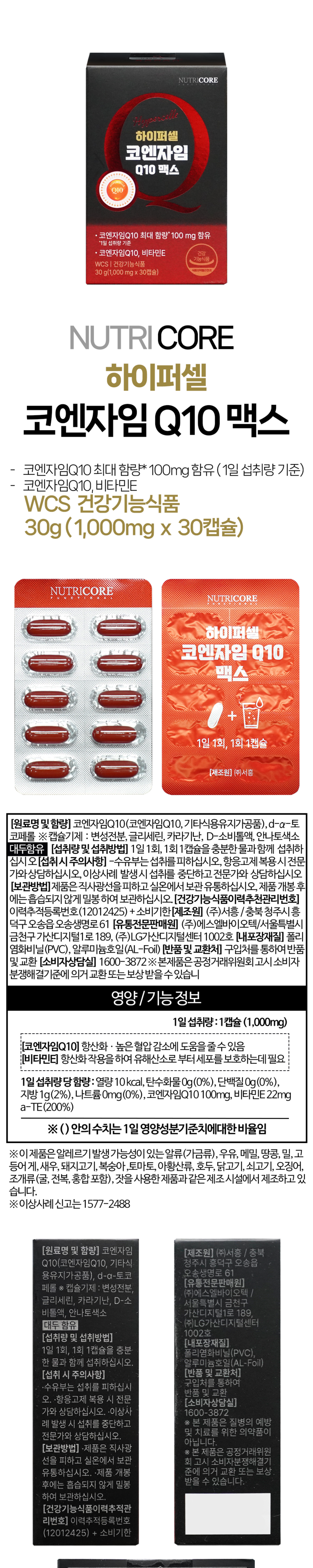 | 제품명 | 하이퍼셀 코엔자임Q10 맥스 | 제조업소의 명칭과 소재지 | (주)서흥 / 충북 청주시 흥덕구 오송읍 오송생명로 61주)에스엘바이오텍/서울특별시 금천구 가산디지털1로 189, (주)LG가산디지털센터 1002호 |