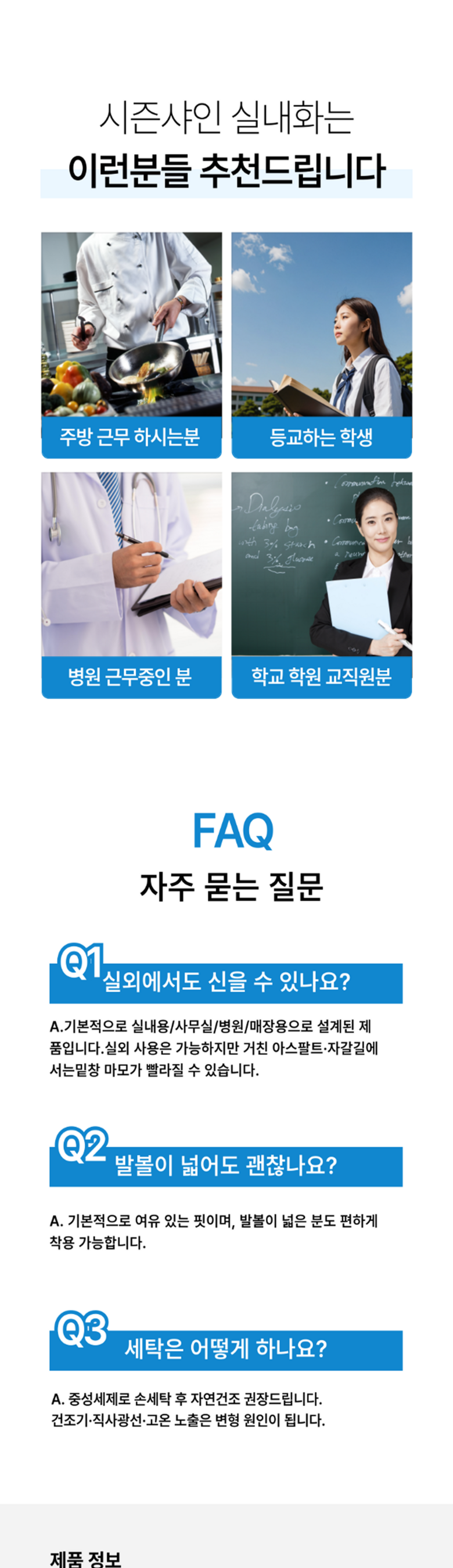 | 제품의 주소재(운동화인 경우에는 겉감,안감을 구분하여 표시) | 상품 상세페이지 참조 | 색상 | 상품 상세페이지 참조 |