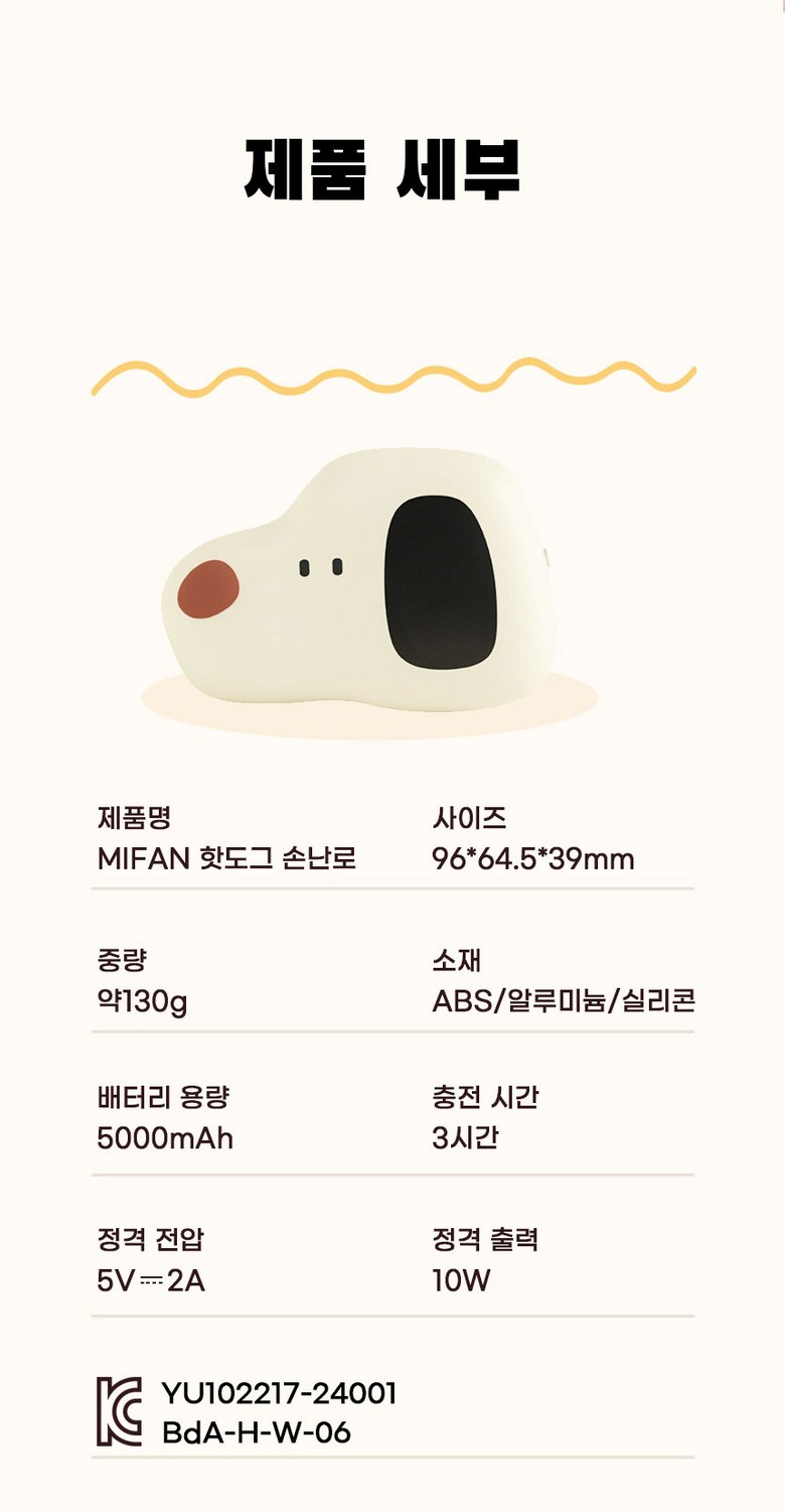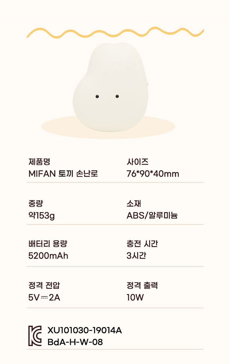 | 품명 및 모델명 | MIFAN 미니 휴대용 usb 충전식 손난로 | KC 인증정보 | 안전 확인:YU102217-24001 EMC:BdA-H-W-06안전 확인:XU101030-19014A EMC:BdA-H-W-08 |