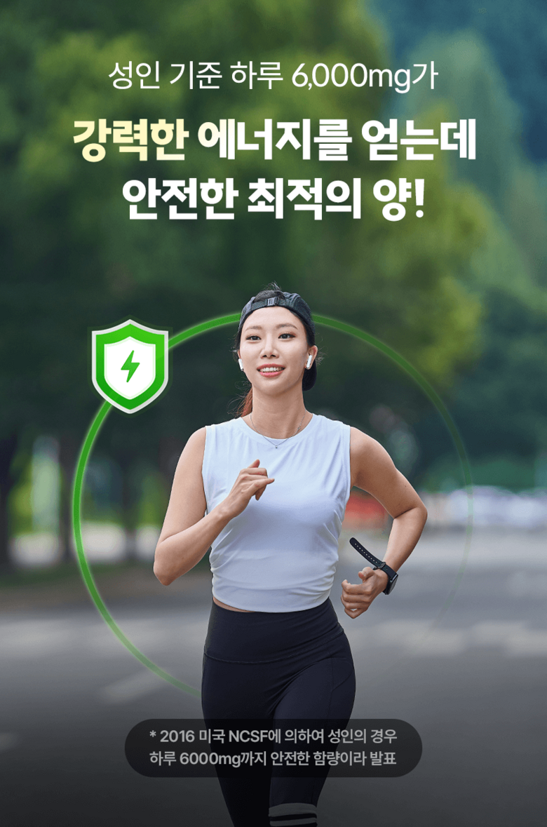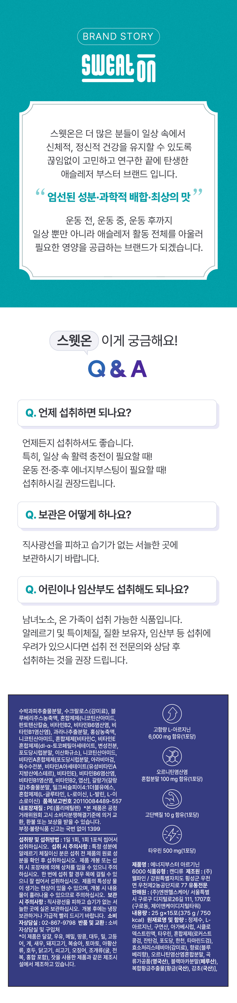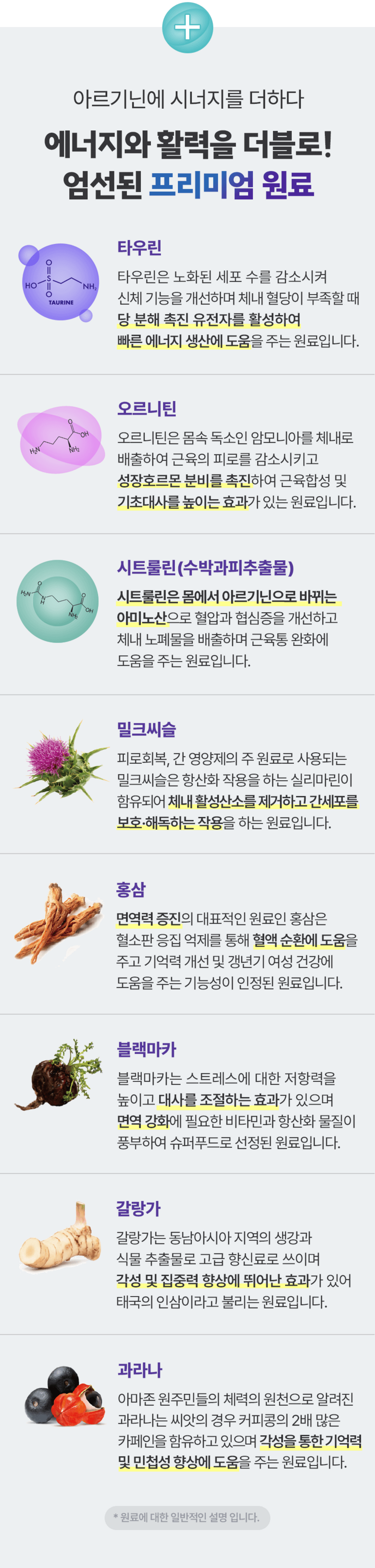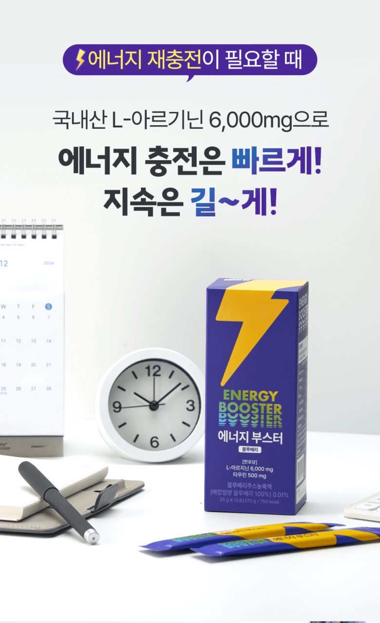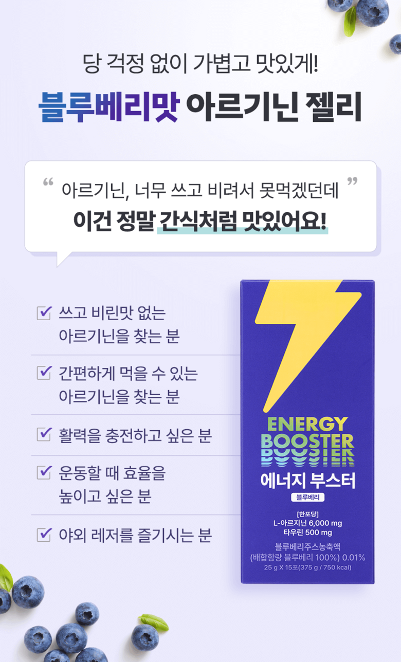 | 원료명 및 함량 | 정제수, L-아르지닌,구연산,아가베시럽,시클로덱스트린시럽,타우린,기타가공품(한천:인도네시아산),효소처리스테비아,향료(블루베리향)오르티닌염산염혼합분말,곡류가공품,블랙마카분말,복합황금추출물,수박과피 | 영양정보 | 1포(25 g)당 50kcal나트륨 10mg탄수화물 2g당류 2g지방 0g트랜스지방 0g포화지방 0g콜레스테롤 0 mg단백질 10 g |