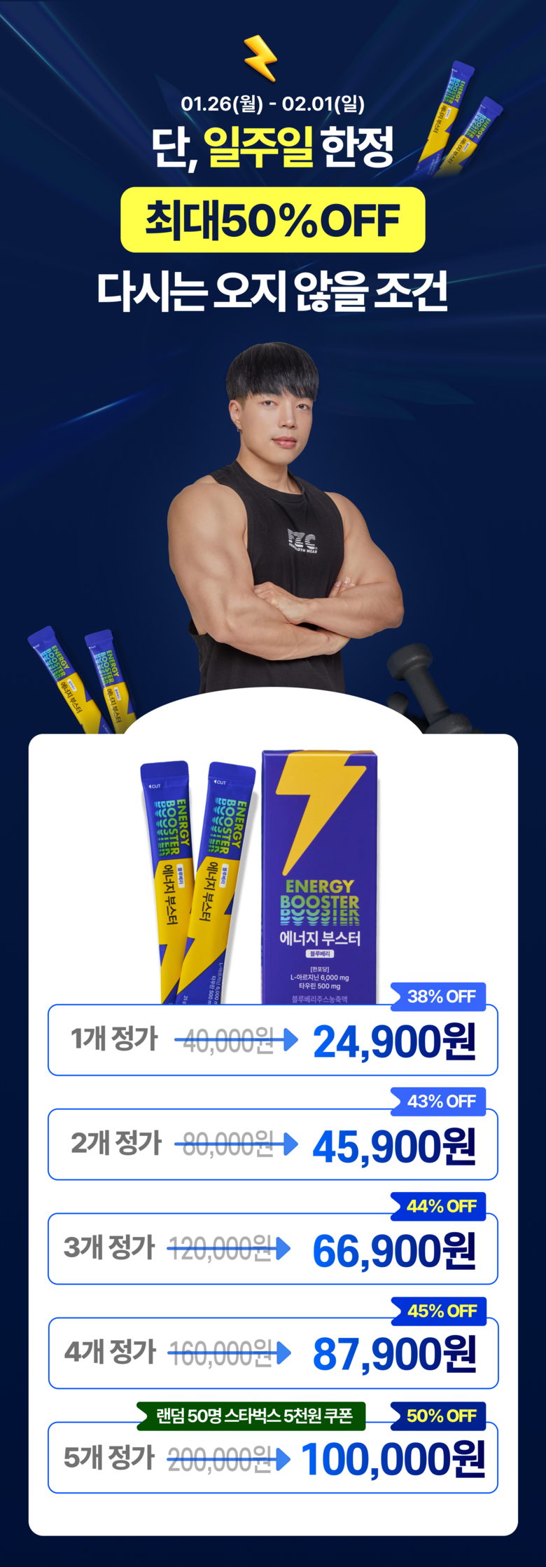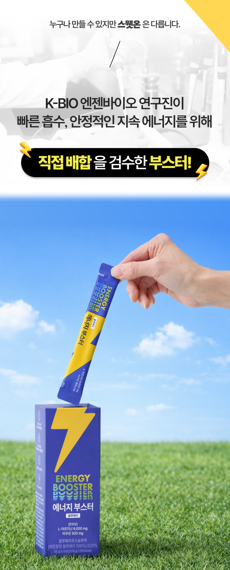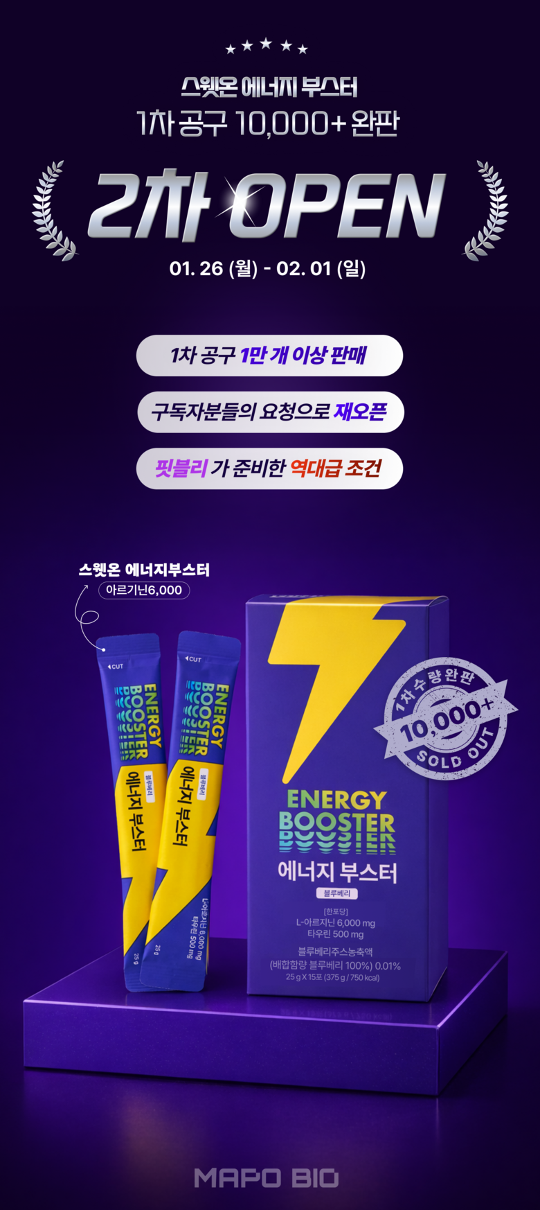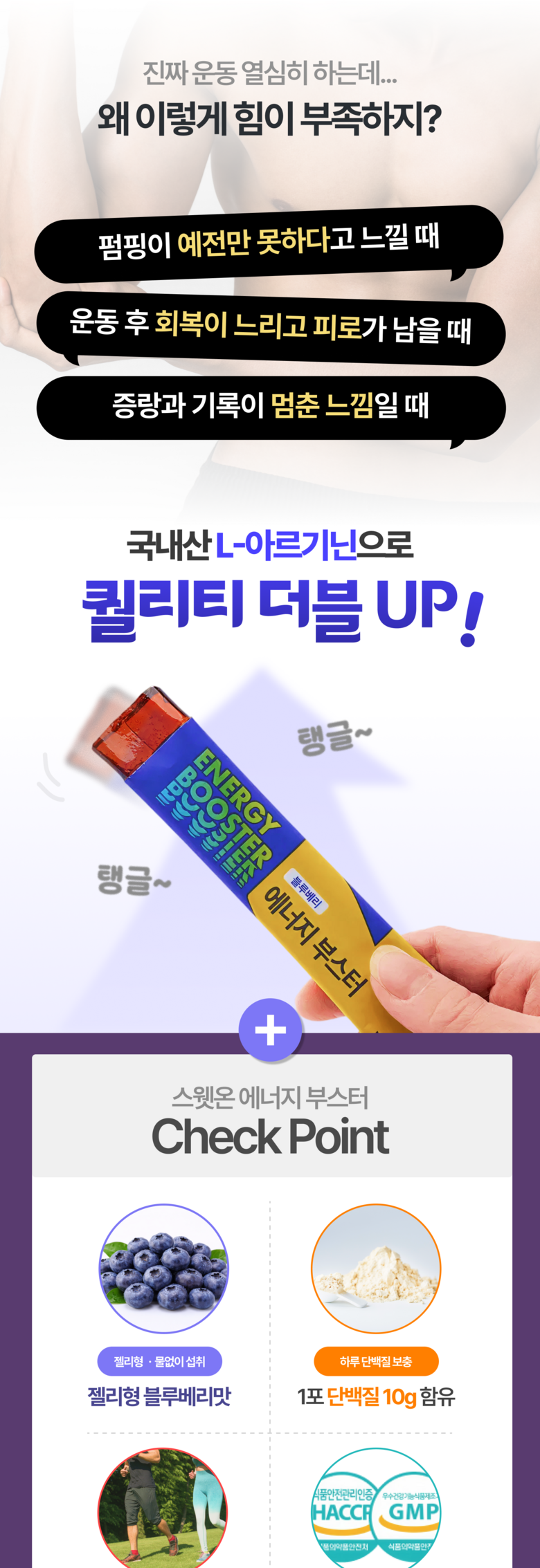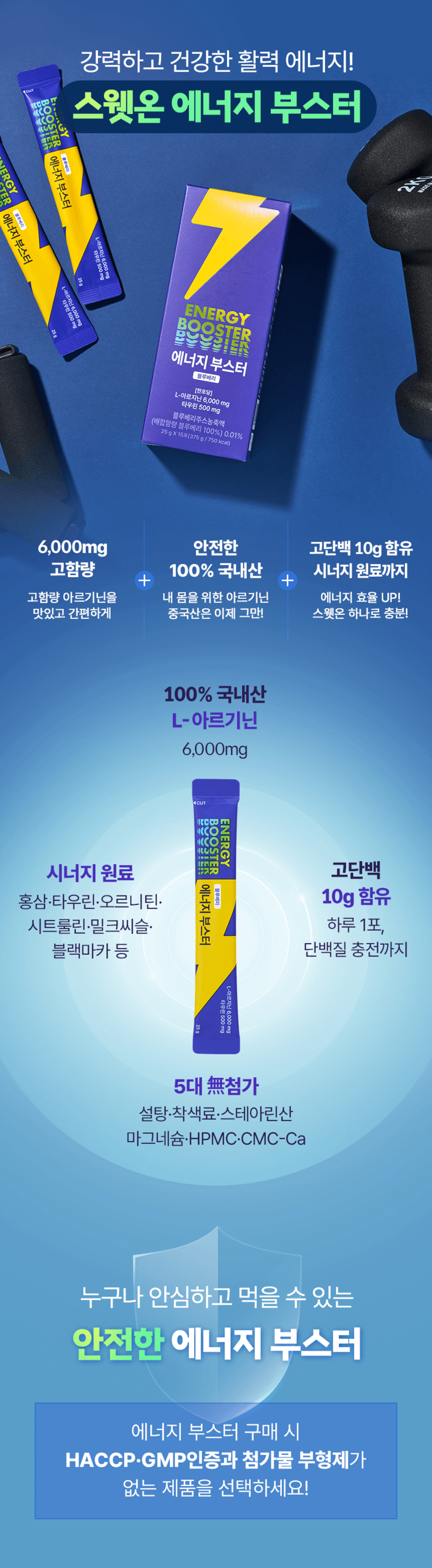 | 원료명 및 함량 | 정제수, L-아르지닌,구연산,아가베시럽,시클로덱스트린시럽,타우린,기타가공품(한천:인도네시아산),효소처리스테비아,향료(블루베리향)오르티닌염산염혼합분말,곡류가공품,블랙마카분말,복합황금추출물,수박과피 | 영양정보 | 1포(25 g)당 50kcal나트륨 10mg탄수화물 2g당류 2g지방 0g트랜스지방 0g포화지방 0g콜레스테롤 0 mg단백질 10 g |