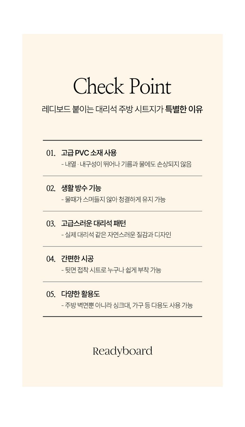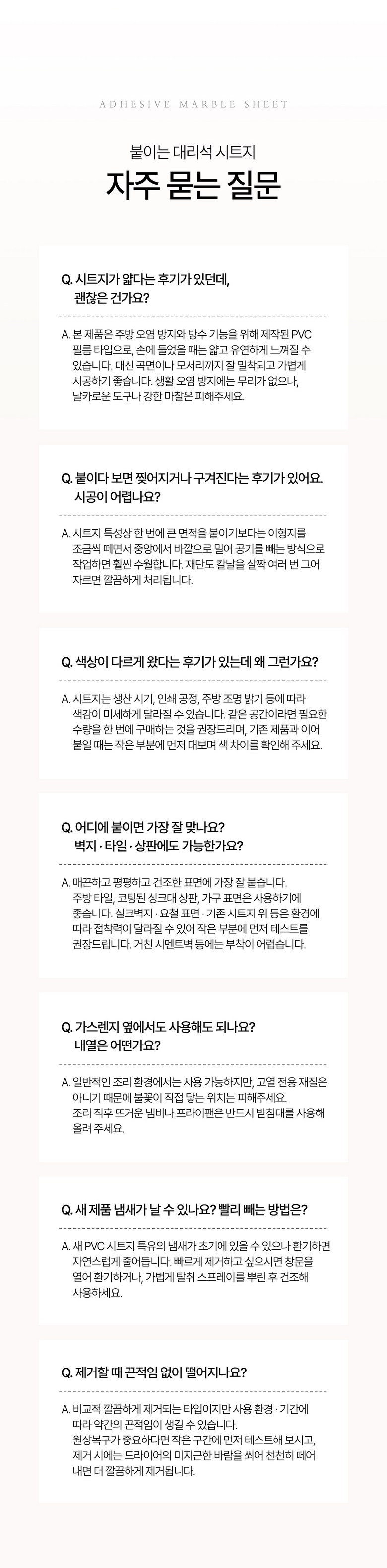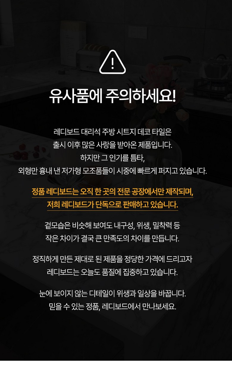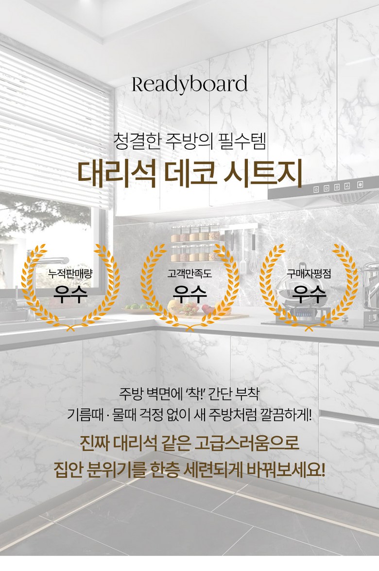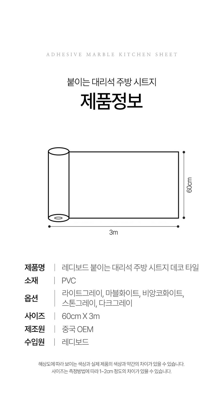 | 품명 및 모델명 | 레디보드 붙이는 오염방지 주방 시트지 타일 방수 데코 대리석 | 인증/허가 사항 | 상품 상세페이지 참조 |