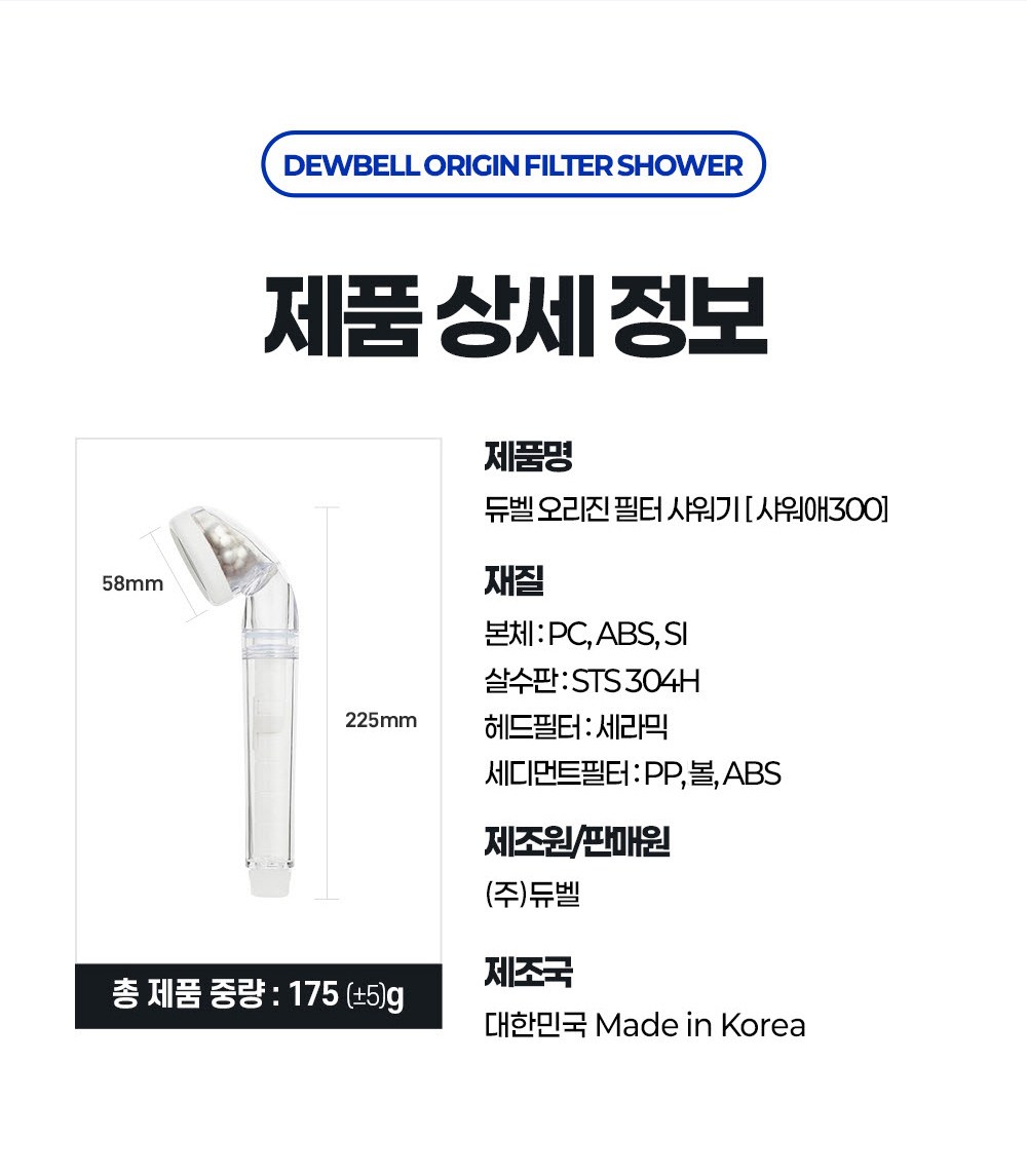 | 품명 및 모델명 | 듀벨 오리진 필터샤워기 + 리필필터 7개 | 인증/허가 사항 | 해당없음 |