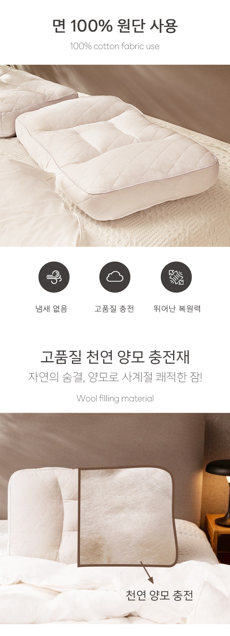 ✔ 양모 충전재 : 체온을 일정하게 유지해주며, 습도 조절 및 냄새 억제 효과