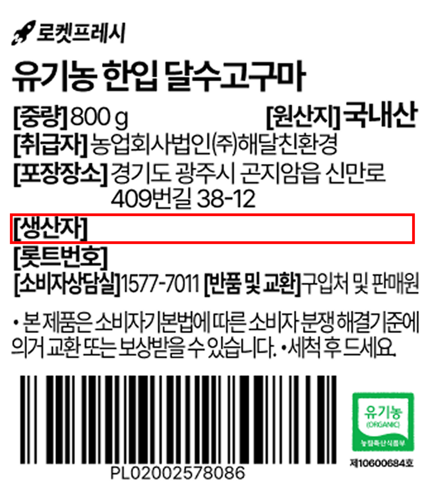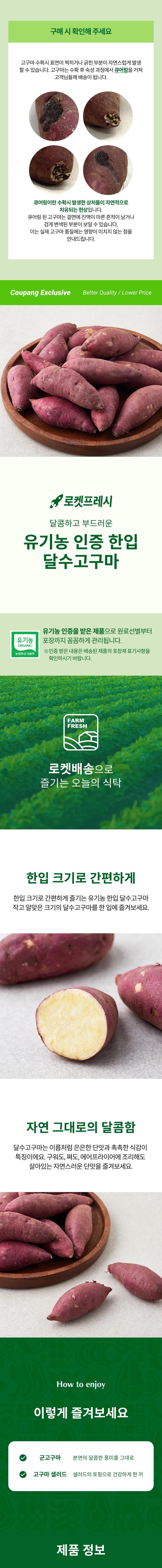 | 품목 또는 명칭 | 유기농 한입 달수고구마 | 포장단위별 내용물의 용량(중량),수량,크기 | 800g x 1개입 x 2개 |