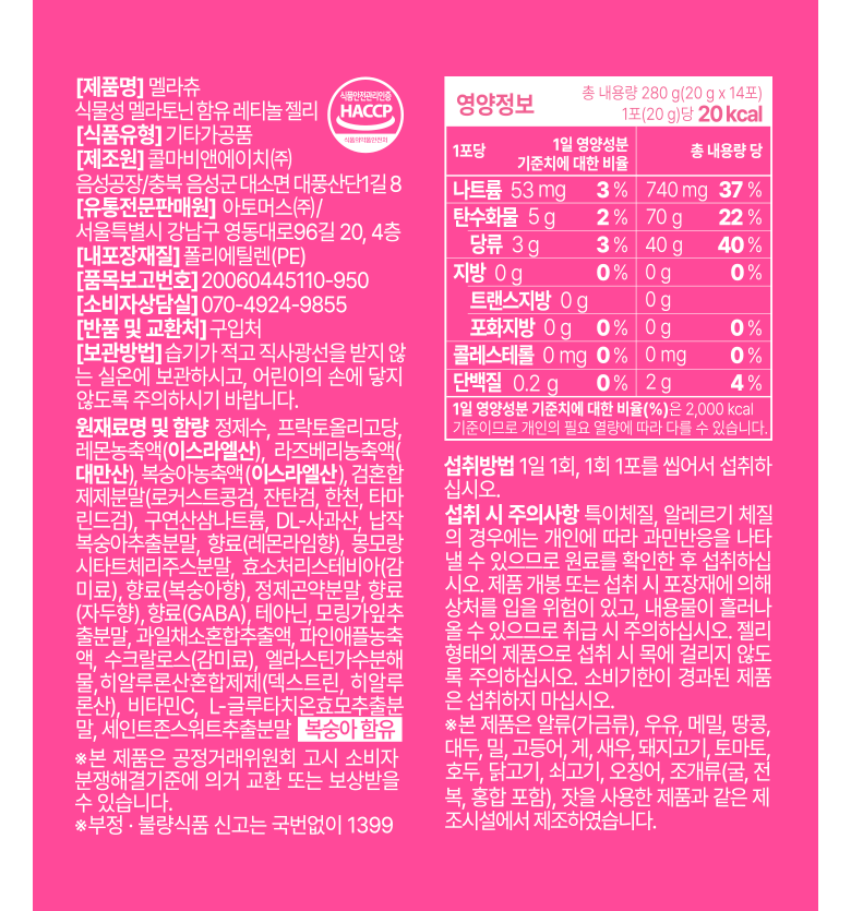 | 제조연월일, 유통기한 또는 품질유지기한 | 제조일로부터 18개월 | 포장단위별 용량(중량), 수량 | 20g x 14포 [280g] |