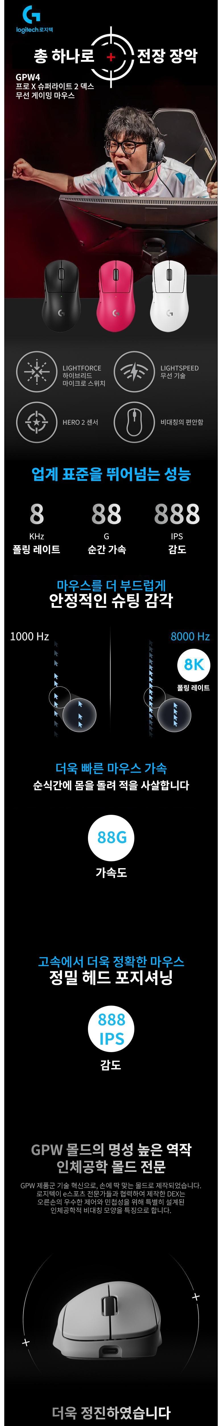 본 제품은 최대 44000 DPI, 차세대 라이트스피트 무선 기술, 라이트포스 하이브리드 마이크로 모션, 8KHz 폴링 속도를 지원합니다.