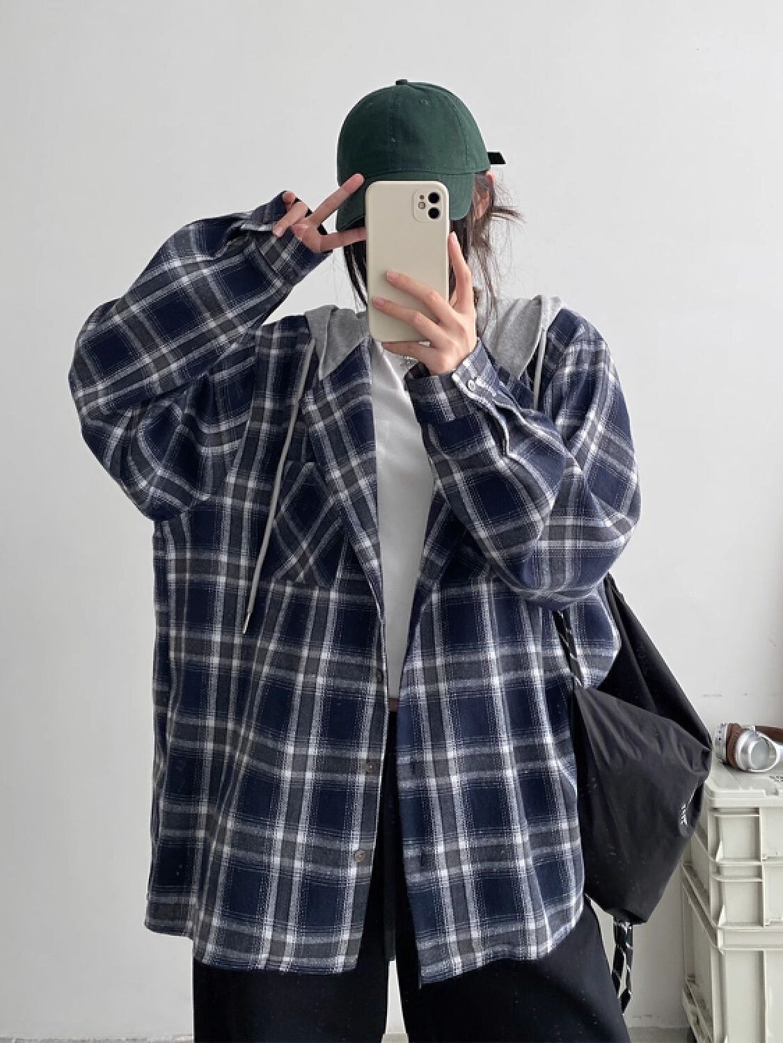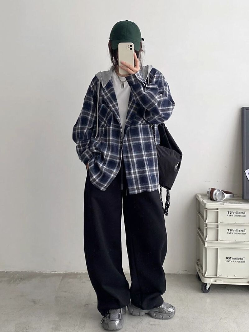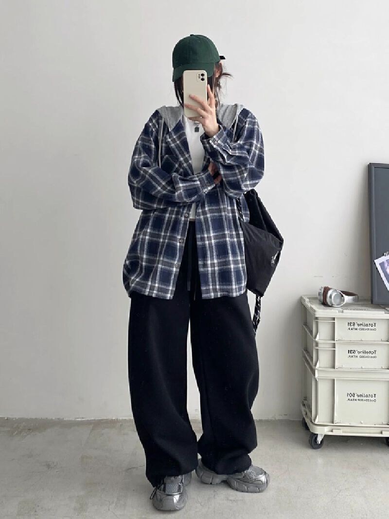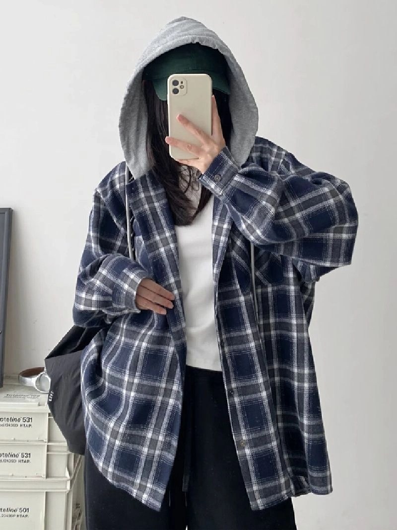 투니스 여성 빈티지 루즈핏 체크 후드 긴소매 셔츠