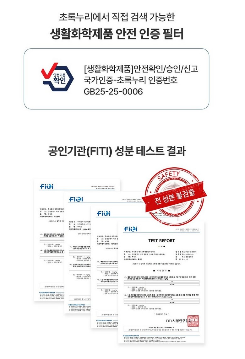 | 품명 및 모델명 | 상품 상세페이지 참조 | KC 인증정보 | 생활화학 안전인증 (GB25-25-0006) 초록누리 |