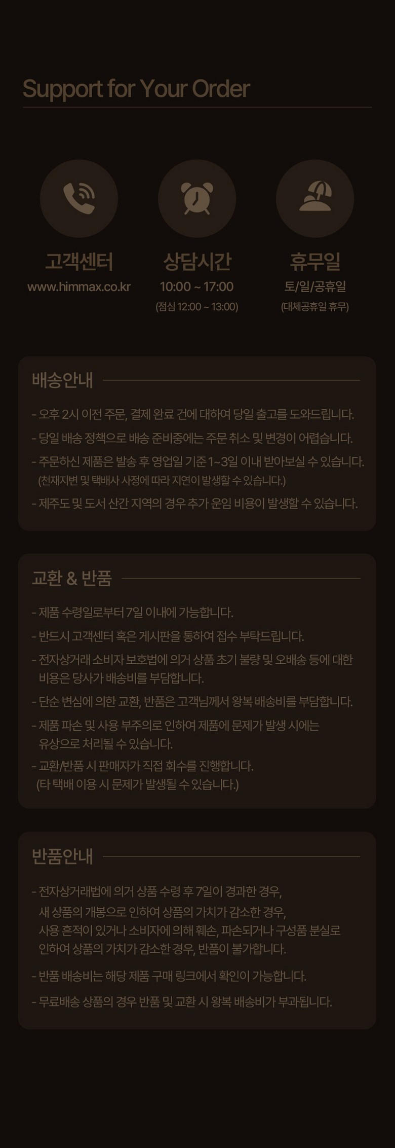 | 교환/반품 신청 기준일 | ㆍ단순변심에 의한 교환/반품은 제품 수령 후 7일 이내까지, 교환/반품 제한사항에 해당하지 않는 경우에만 가능 (배송비용과 교환/반품 비용 왕복배송비 고객부담) ㆍ상품의 내용이 표시·광고의 내용과 다른 경우에는 상품을 수령한 날부터 3개월 이내, 그 사실을 안 날 또는 알 수 있었던 날부터 |