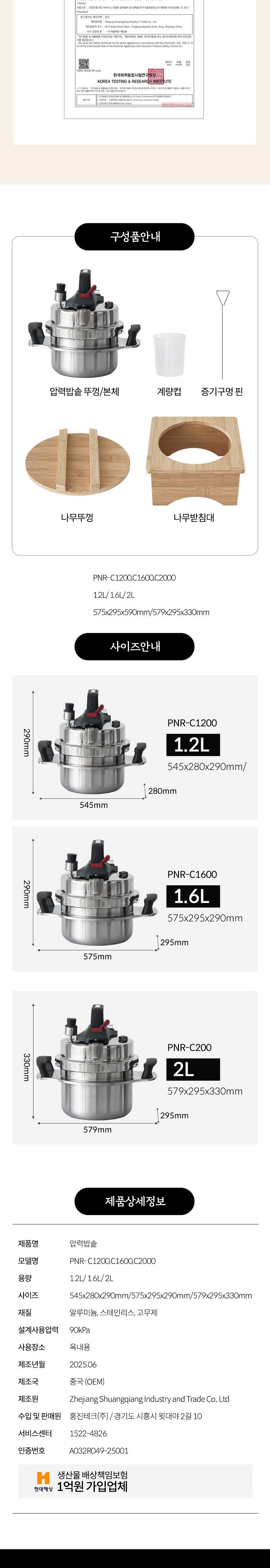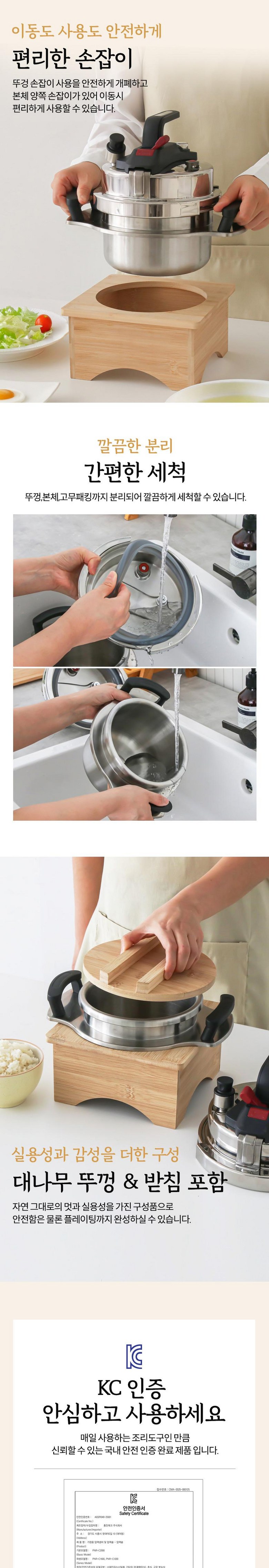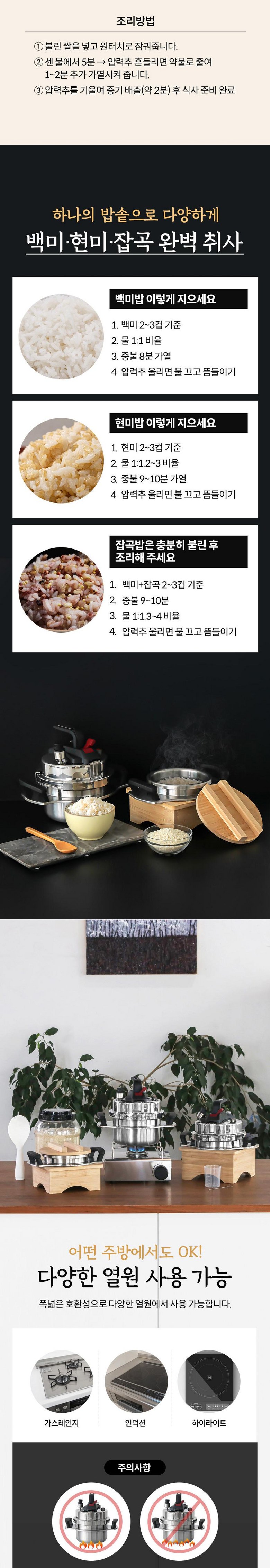 | 구성품 | 압력밥솥 뚜껑/본체, 계량컵, 증기구멍 핀, 나무뚜껑, 나무받침대, 고무패킹 | 크기 | 545x280x290 mm / 575x295x290 mm / 579x295x330mm / 1.2L/1.6L/2L |