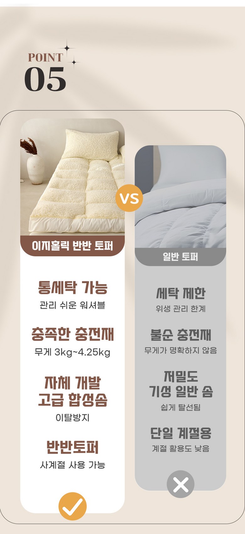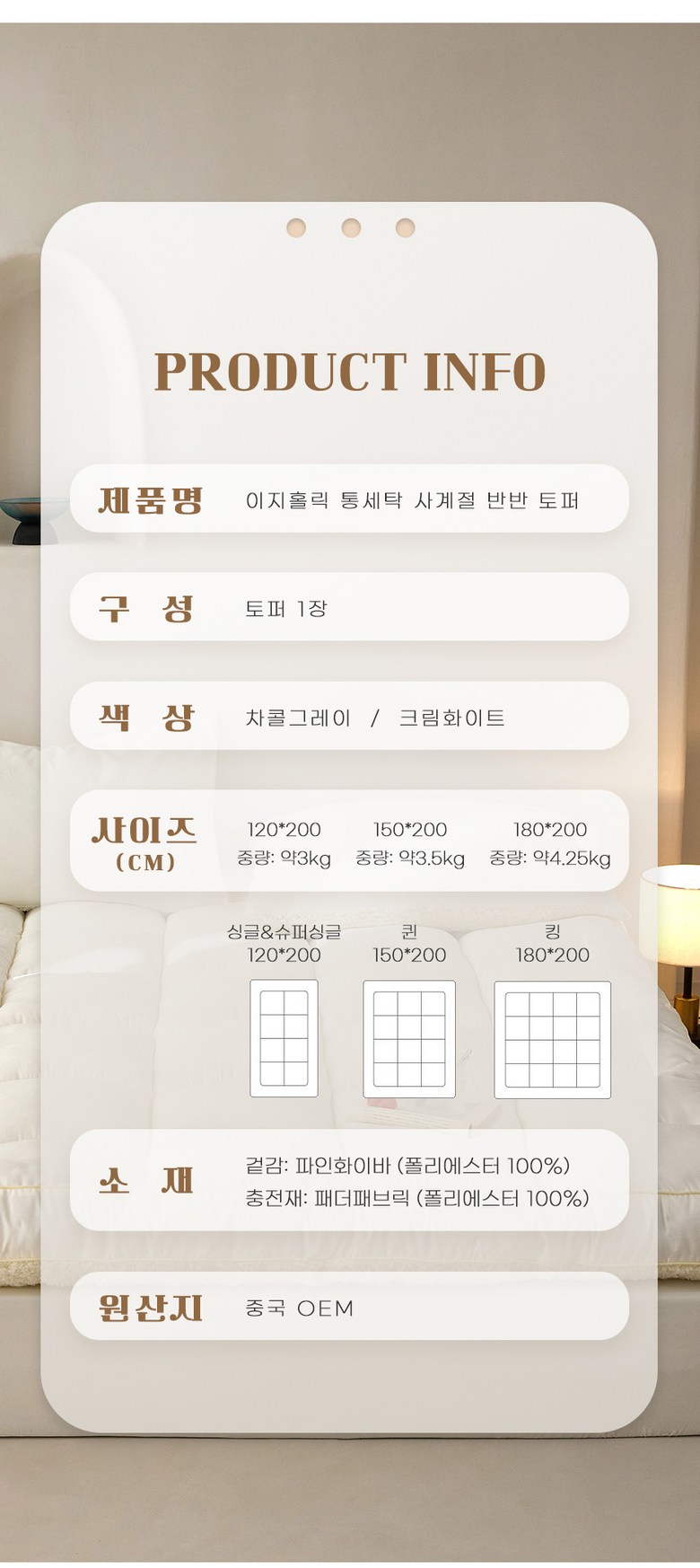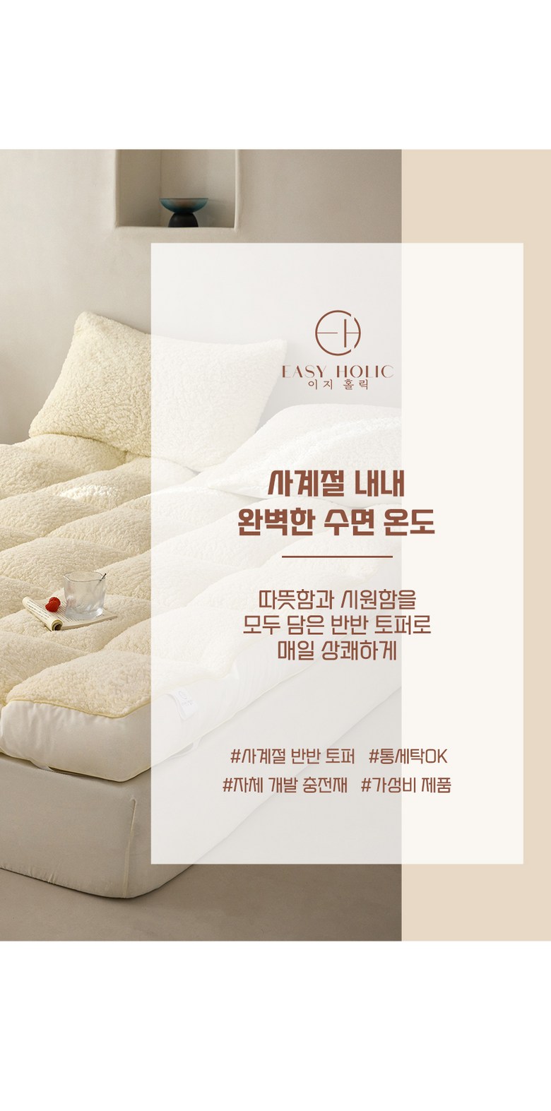 | 품명 및 모델명 | 이지홀릭 통세탁 사계절 반반 침대 토퍼 매트리스 | 인증/허가 사항 | 상품 상세페이지 참조 |