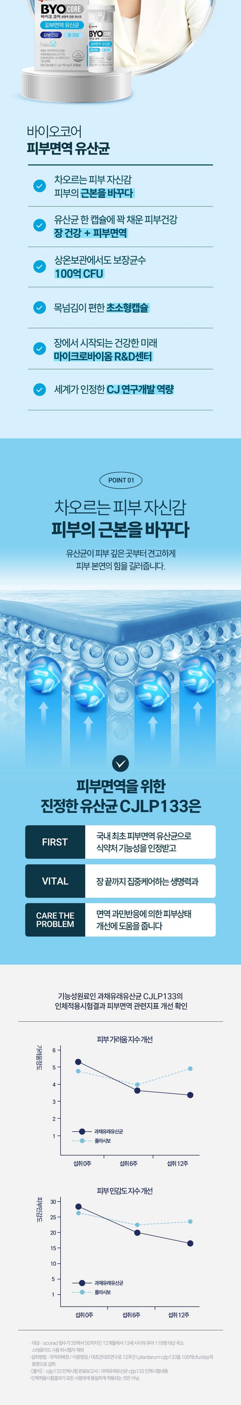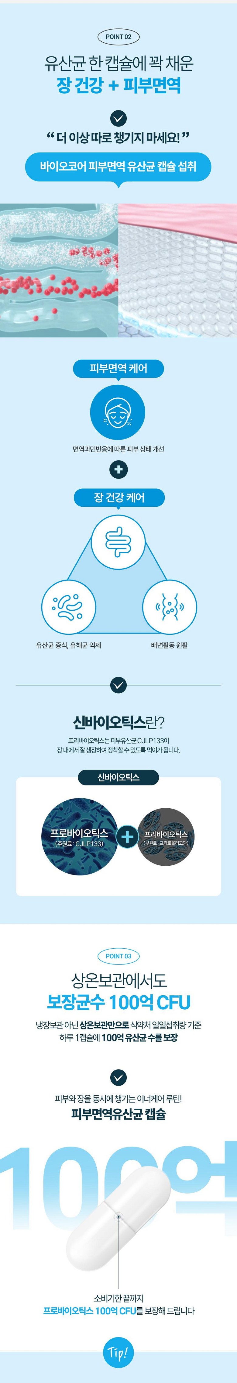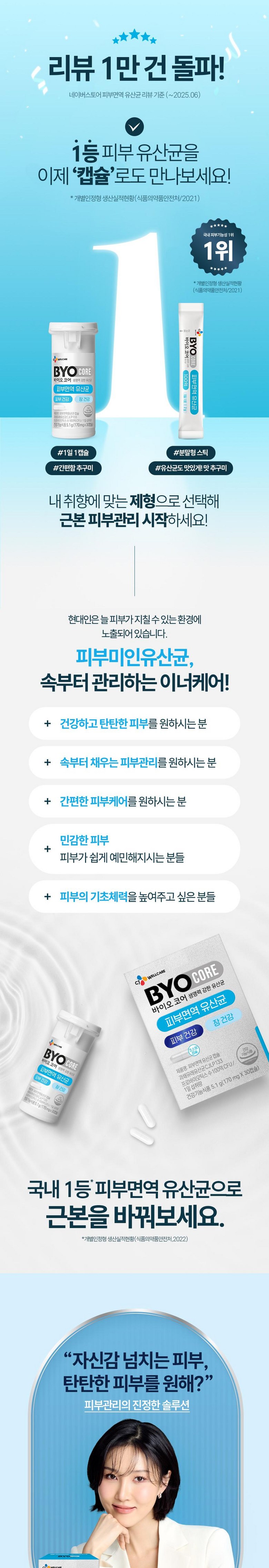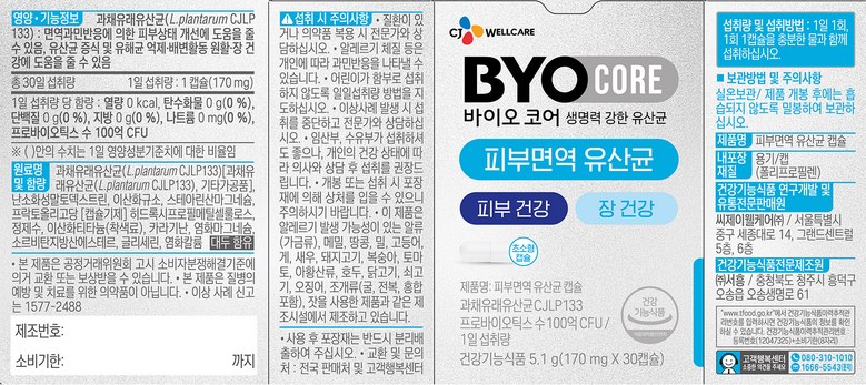 | 제품명 | 바이오코어 피부면역 유산균 캡슐 | 제조업소의 명칭과 소재지 | •유통전문판매원 : 씨제이웰케어㈜ 서울특별시 중구 세종대로 14 그랜드센트럴 5층, 6층•제조원 : 충청북도 청주시 흥덕구 오송읍 오송생명로 61 |