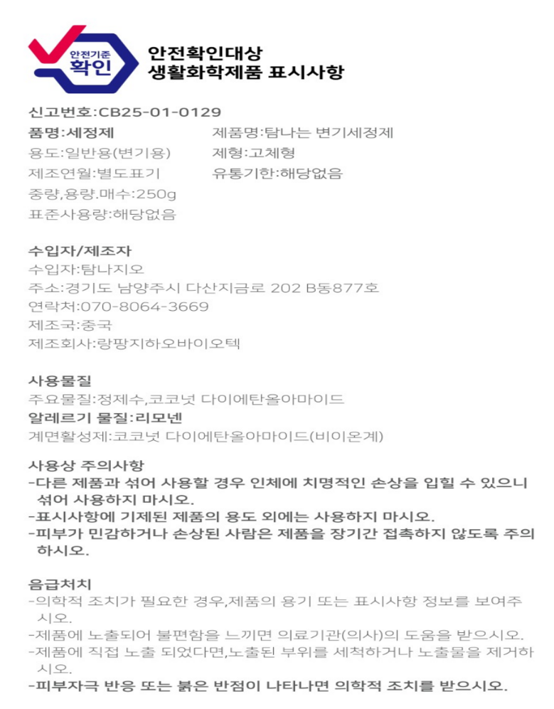 | 품목 및 제품명 | 상품 상세페이지 참조 | 용도(표백제의 경우 계열을 함께표시) 및 제형 | 상품 상세페이지 참조 |