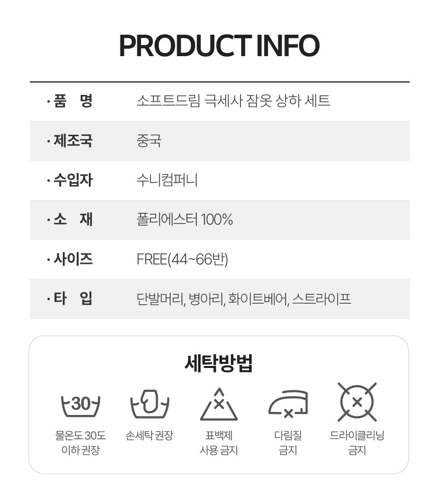 | 제조국 | 중국 | 세탁방법 및 취급시 주의사항 | 컨텐츠 참조 |