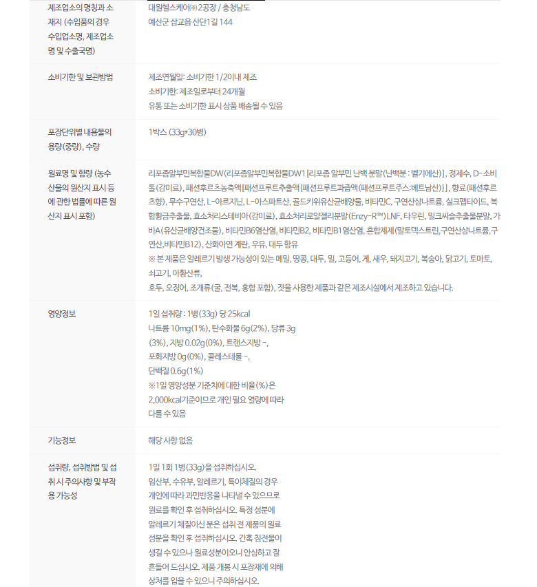 | 제조연월일, 소비기한 또는 품질유지기한 | 상품 상세페이지 참조 | 세부 품목군별 표시사항 | 상품 상세페이지 참조 |