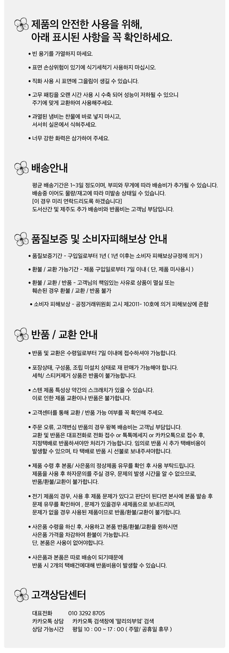 | 교환/반품 신청 기준일 | ㆍ단순변심에 의한 교환/반품은 제품 수령 후 7일 이내까지, 교환/반품 제한사항에 해당하지 않는 경우에만 가능 (배송비용과 교환/반품 비용 왕복배송비 고객부담) ㆍ상품의 내용이 표시·광고의 내용과 다른 경우에는 상품을 수령한 날부터 3개월 이내, 그 사실을 안 날 또는 알 수 있었던 날부터 |