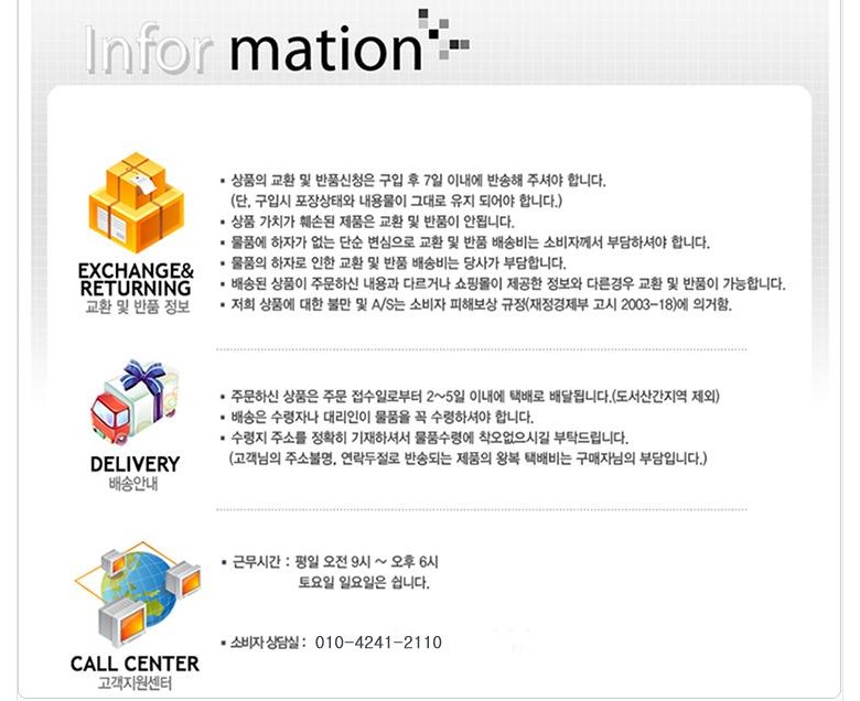 - ㆍ교환/반품에 관한 일반적인 사항은 판매자가 제시사항보다 관계법령이 우선합니다.