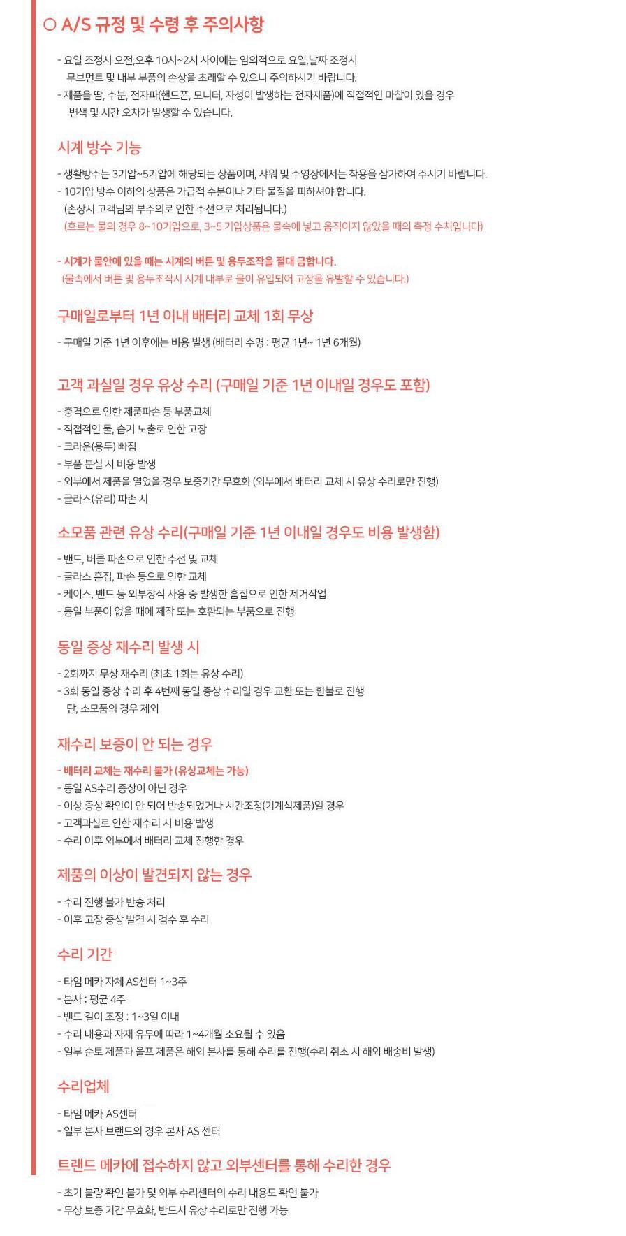 | 제조국 | 중국 | 취급시 주의사항 | 1.화장품,향수,마찰 등으로 변색,탈색,이염 등 상품 손상이 될 수 있으니 주의 2.피부가 민감하여 알레르기 반응이 있을 시 착용 중지 3.자석과 관련된 물건은 1m이상 거리 두기 4.충격과 비틀림에 의한 파손 주의 5.습기와 물에 주의 (물속에 있을 때 용두나 버튼 작동 금물) 6.온도가 너무 높거나 낮은 곳에 오래 둘 경우 오작동의 원인 (배터리 수명 또한 단축) 7.오토시계의 경우 8시간 이상 착용 시 충분한 운동량을 주어야 충전 완료됨 |