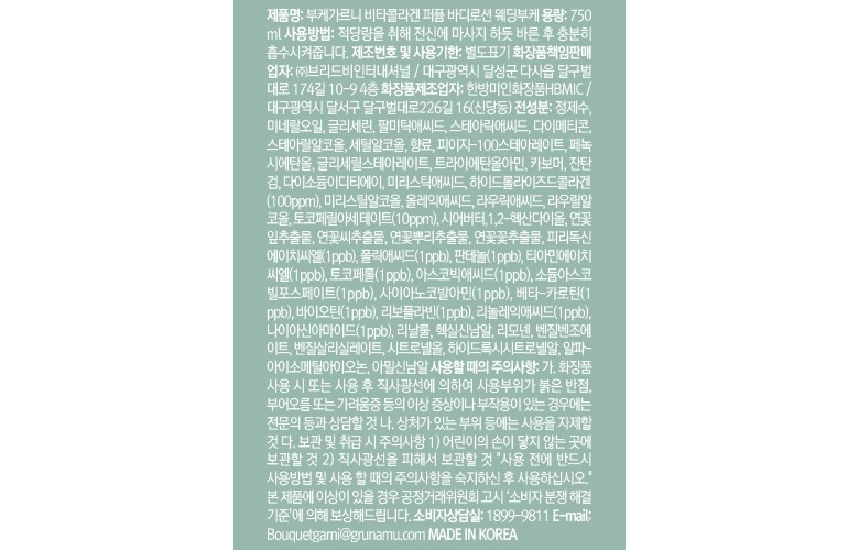 | 화장품제조업자, 화장품책임판매업자 및 맞춤형화장품판매업자 | 컨텐츠 참조 | 제조국 | 컨텐츠 참조 |