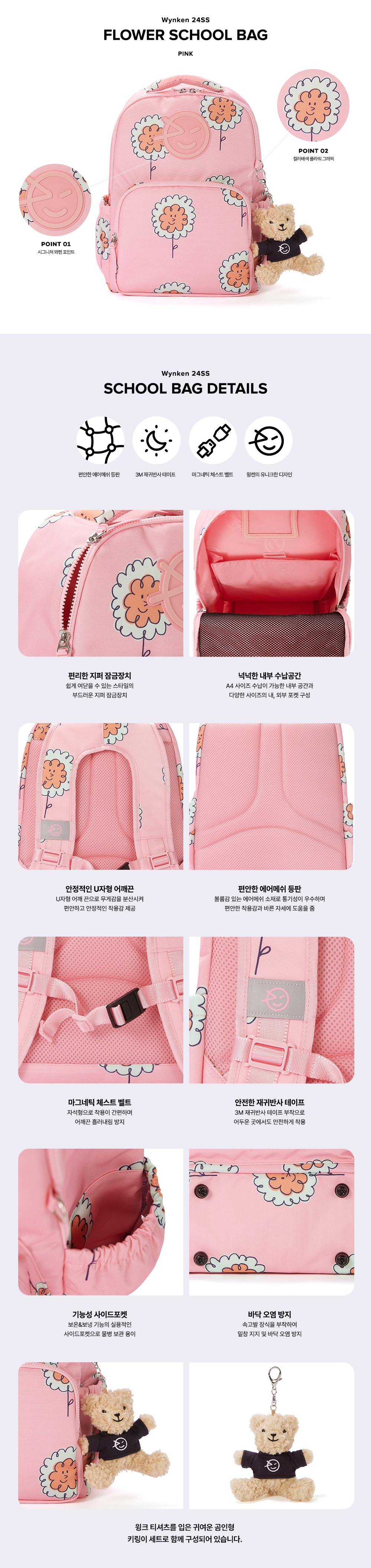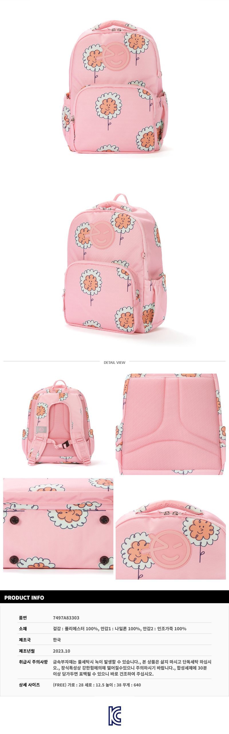 | 품명 및 모델명 | 리틀그라운드 윙켄 플라워스쿨백 핑크 + 키링세트 | KC 인증정보 | 가방: 유/KC마크 I 키링: CB064R193-3006 |