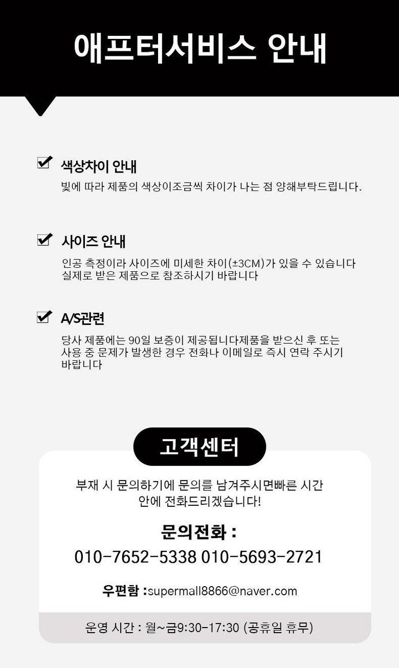 | 소비자상담 관련 전화번호 | 어떤 문제가 발생하더라도 우선 연락 주십시오설치, 결함, 부품 누락, 기능 설명 등의 문제전화기:010-7652-5338메일박스:supermall8866@naver.com | ||