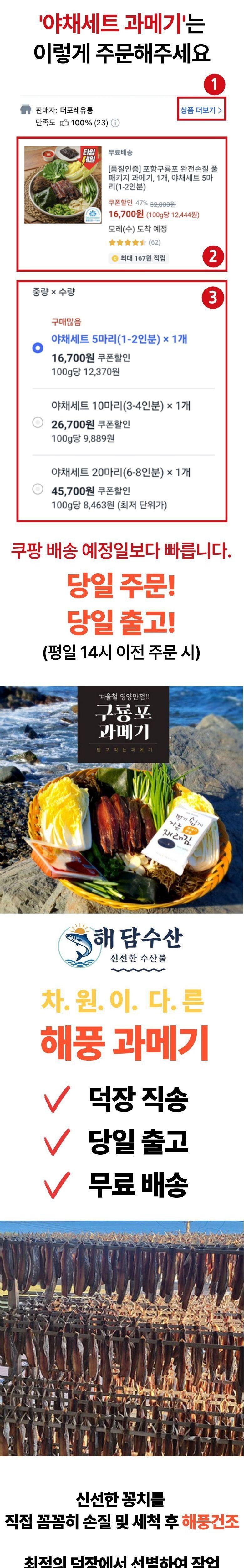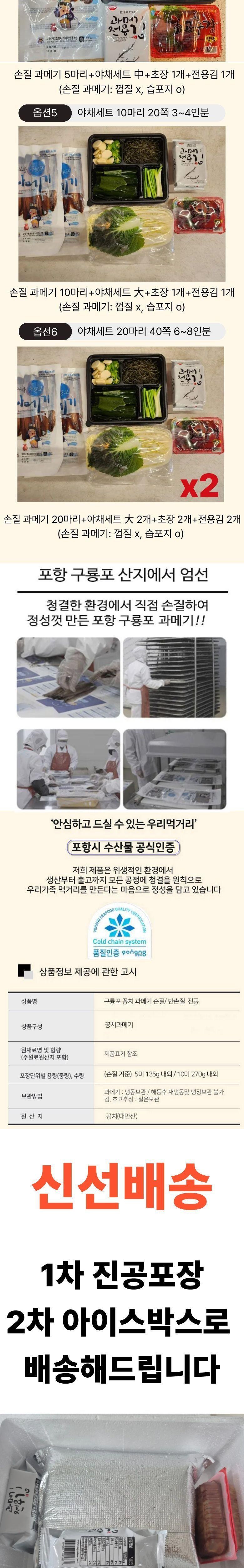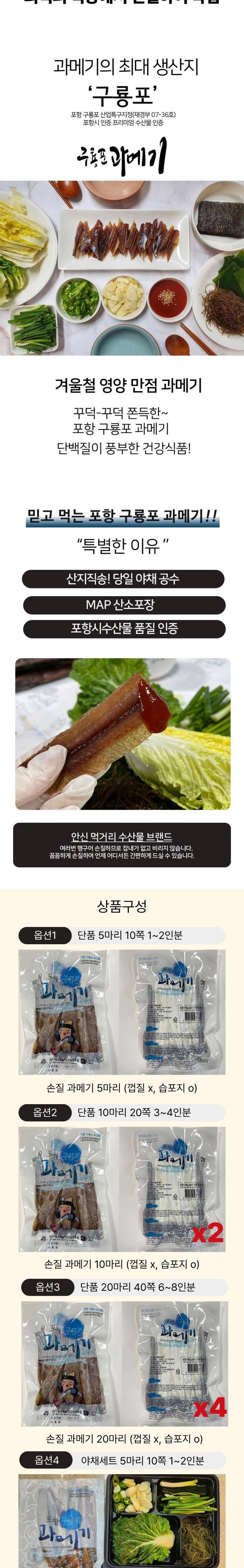 | 품목 또는 명칭 | [포항시인증] 산지직송 프리미엄 구룡포 과메기 | 포장단위별 내용물의 용량(중량),수량,크기 | 상품 상세페이지 참조 |