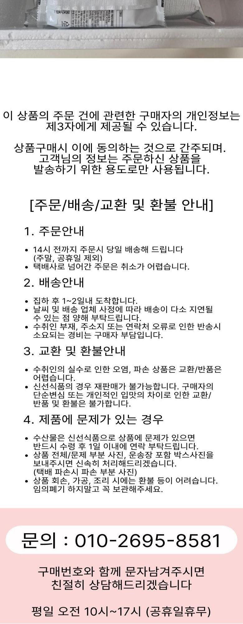 | 배송방법 | 신선/냉장/냉동 | 배송비 | 무료배송 - 도서산간 지역 배송불가 |