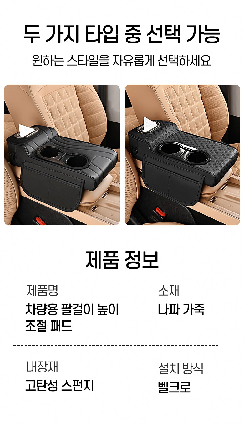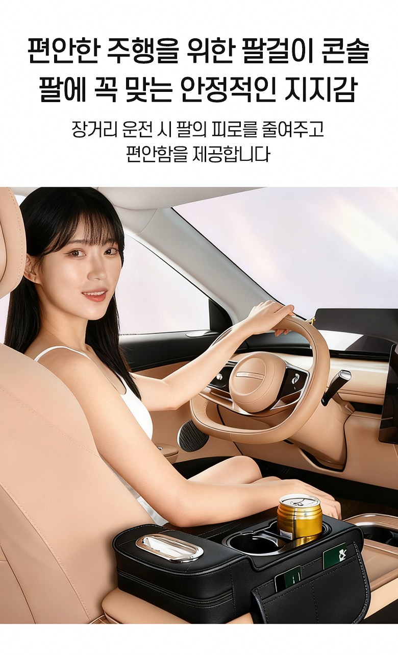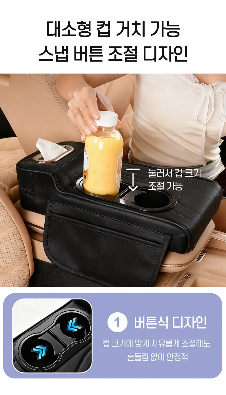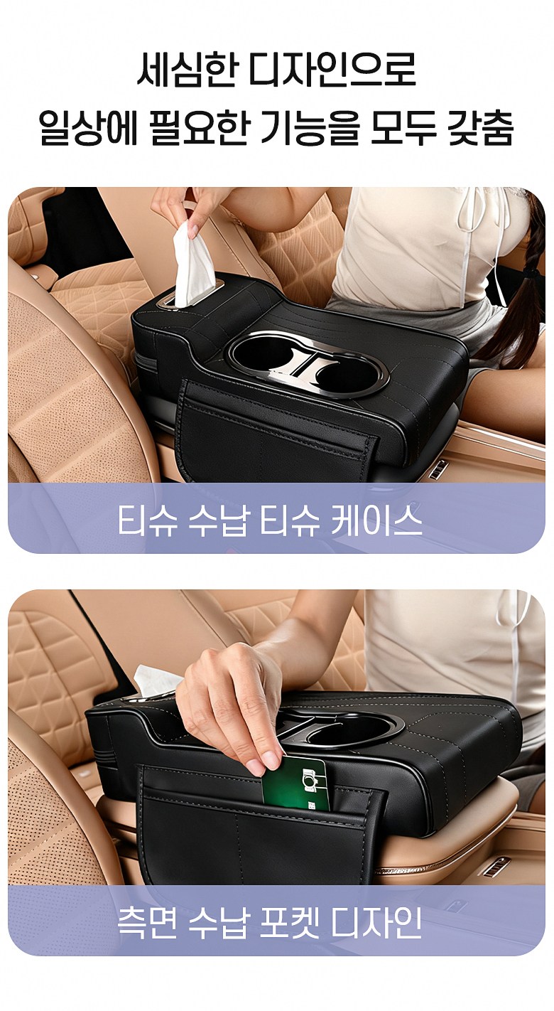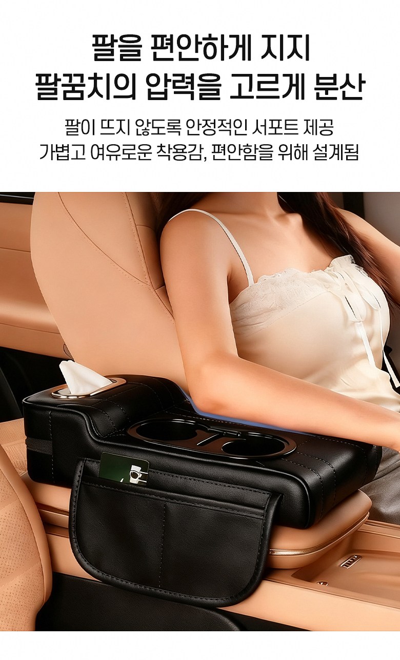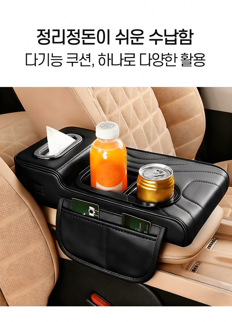 MIVONA 차량용 콘솔쿠션 팔걸이쿠션 4in1 컵홀더 티슈 수납 키높이형, 블랙, 1개