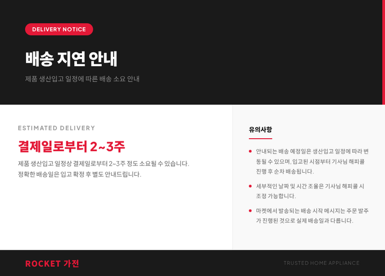 | 배송기간 | ㆍ도서산간 지역 등은 배송에 3-5일이 더 소요될 수 있습니다. - 천재지변, 물량 수급 변동 등 예외적인 사유 발생 시, 다소 지연될 수 있는 점 양해 부탁드립니다. | ||