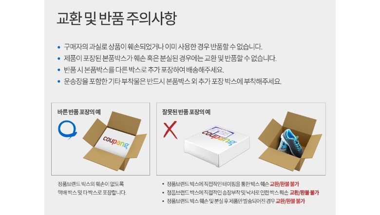 | 교환/반품 신청 기준일 | ㆍ단순변심에 의한 교환/반품은 제품 수령 후 7일 이내까지, 교환/반품 제한사항에 해당하지 않는 경우에만 가능 (배송비용과 교환/반품 비용 왕복배송비 고객부담) ㆍ상품의 내용이 표시·광고의 내용과 다른 경우에는 상품을 수령한 날부터 3개월 이내, 그 사실을 안 날 또는 알 수 있었던 날부터 |
