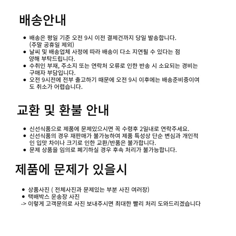 | 배송방법 | 신선/냉장/냉동 | 배송비 | 무료배송 - 도서산간 지역 배송불가 |