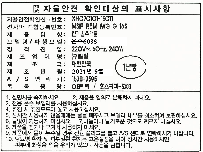 | 품명 및 모델명 | 전기매트 / 온수603S | KC 인증정보 | XH070101-15011ZC, MSIP-REM-IWG-G-16S |