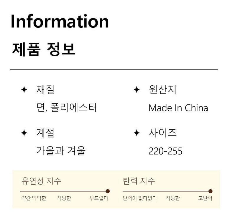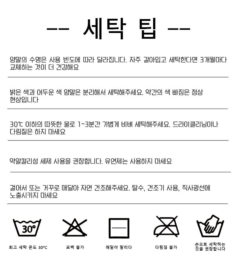 | 제조국 | 중국 | 취급시 주의사항 | 세탁기 사용 가능하나 알칼리성 세제 사용은 피해주세요. 장시간 물에 담가두지 마시기 바랍니다. 연한 색상 제품은 진한 색상 제품과 분리 세탁하여 이염을 방지해주세요. 다림질은 피해주세요. 고온 세탁은 삼가며 과도한 당김은 피해주시기 바랍니다. |