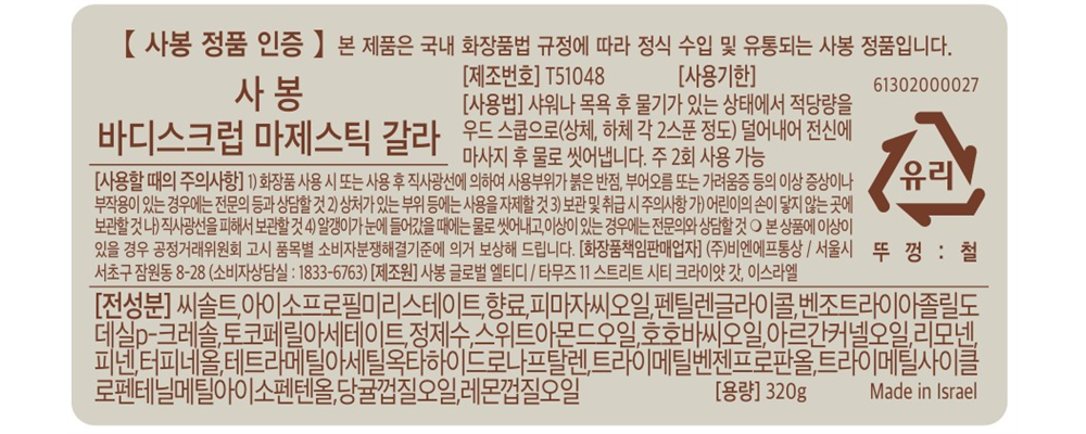 | 화장품제조업자, 화장품책임판매업자 및 맞춤형화장품판매업자 | 컨텐츠 참조 | 제조국 | 이스라엘 |