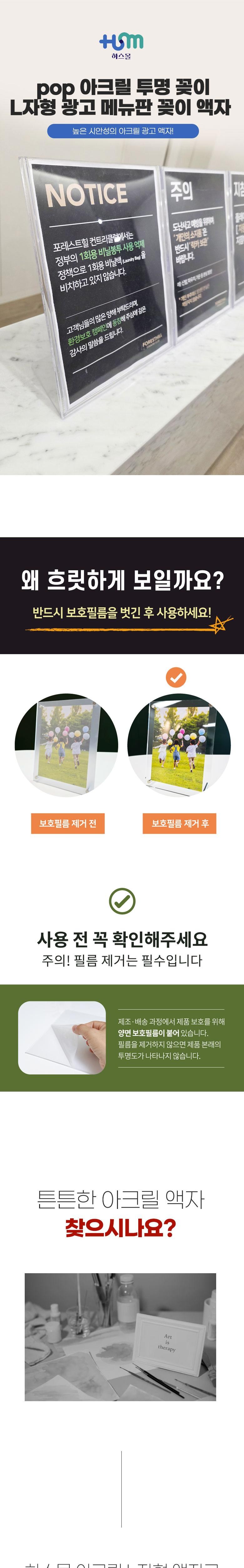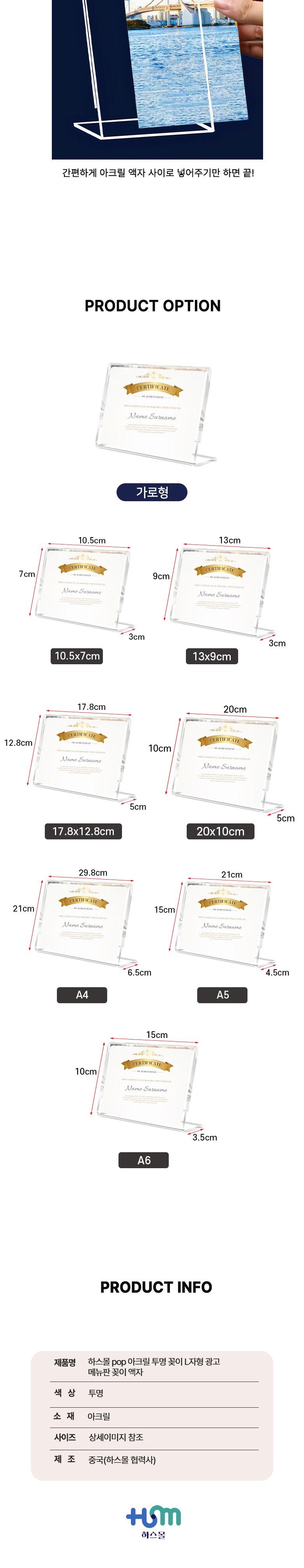 | 품명 및 모델명 | 하스몰 pop 아크릴 투명 꽂이 L자형 광고 메뉴판 꽂이 액자 가로형 | 인증/허가 사항 | 해당사항없음 |