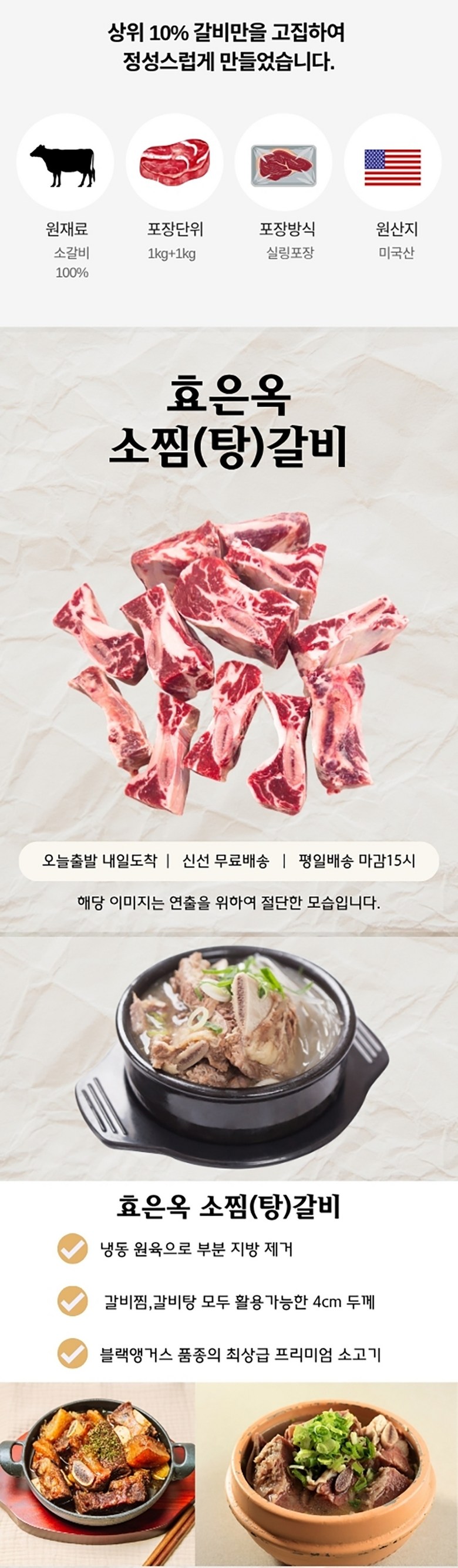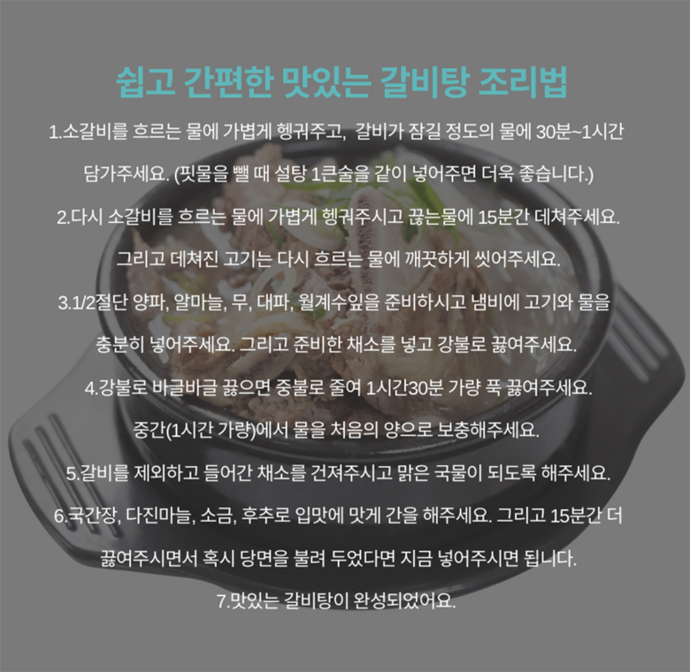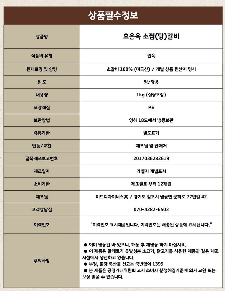 | 품목 또는 명칭 | [1+1] 효은옥 찜갈비, 갈비탕용 미국산 (1kg) | 포장단위별 내용물의 용량(중량),수량,크기 | 상품 상세페이지 참조 |