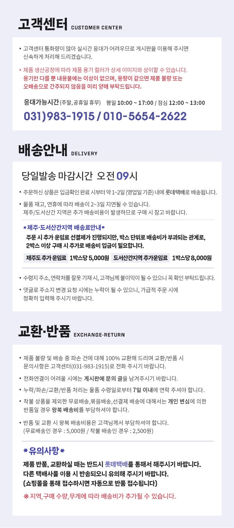 | 배송방법 | 순차배송 | 배송비 | 무료배송 · 도서산간 추가 배송비 - 제주 지역: 5,000원 - 도서산간 지역: 8,000원 |