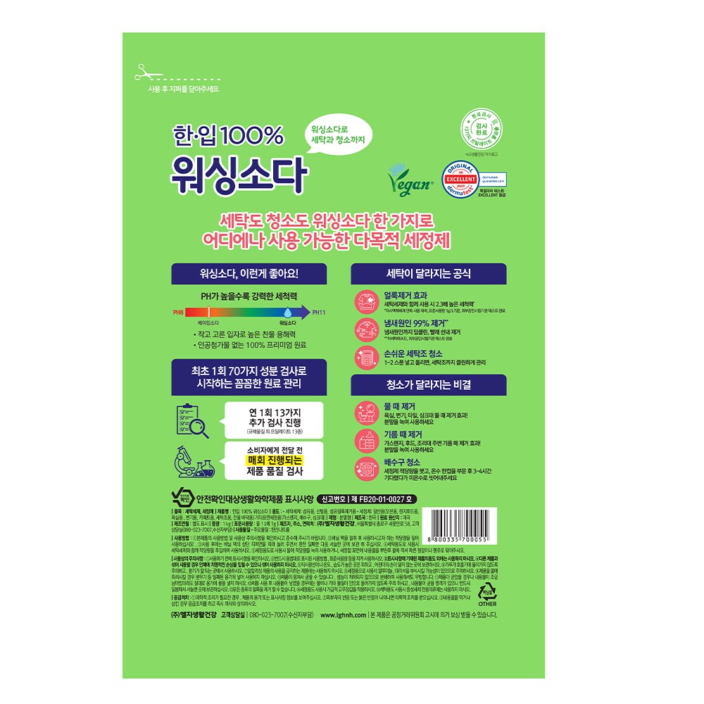 | 품목 및 제품명 | 세정제, 세탁세제 / 한입 100% 워싱소다 | 용도(표백제의 경우 계열을 함께표시) 및 제형 | 세정제: 일반용 (건물 바닥용) 일반용 (기타표면세정용 (가스렌지, 배수구, 싱크대)) 일반용 (렌지후드용) 일반용 (변기용) 일반용 (세탁조용) 일반용 (오븐용) 일반용 (욕실용) 일반용 (카페트용)| 세탁세제:섬유 얼룩제거용 섬유용 신발용 / 분말형 |