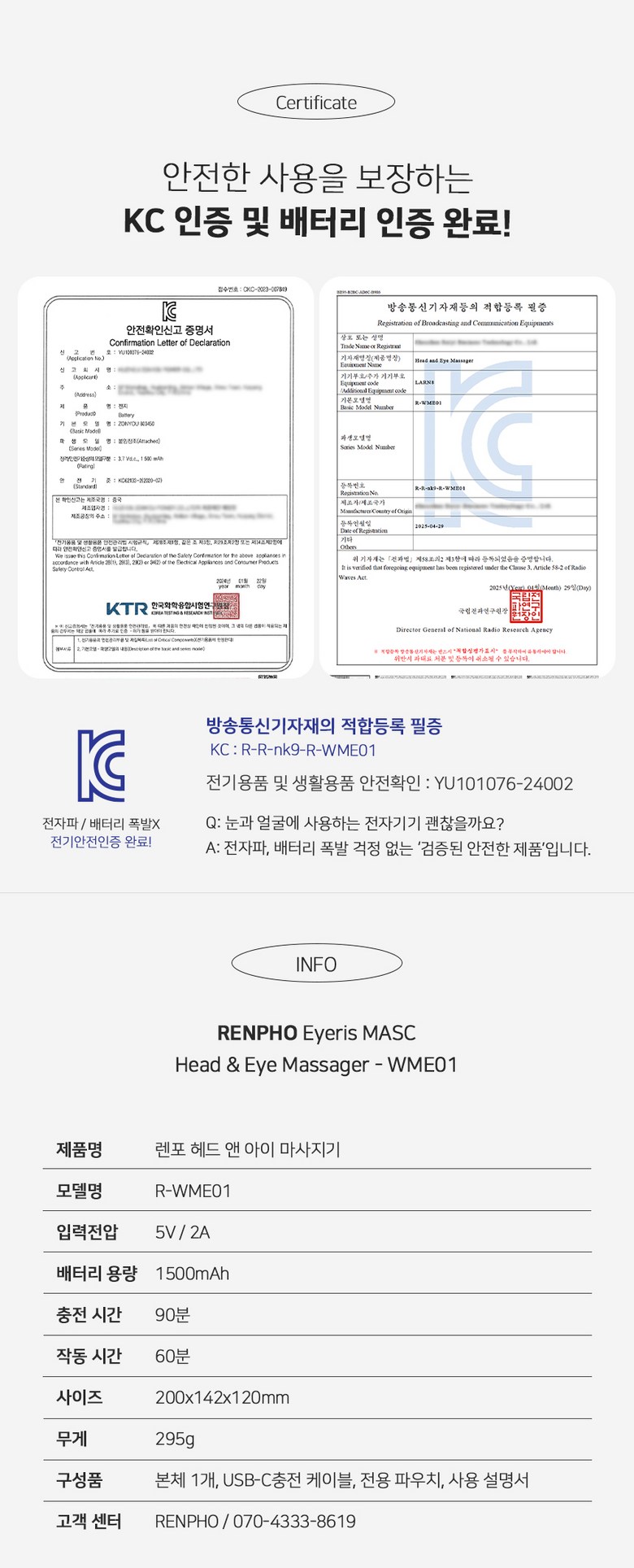 | 품명 및 모델명 | RENPHO 헤드 앤 아이 마사지기 / R-WME01 | KC 인증정보 | 상품 상세페이지 참조 |