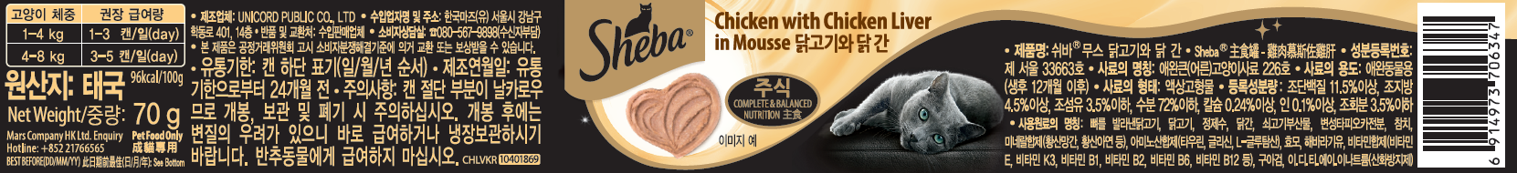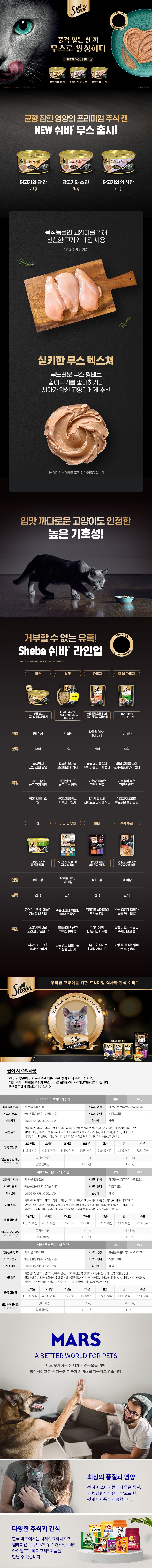 | 품명 및 모델명 | 쉬바 무스 닭고기와 닭 간 | 인증/허가 사항 | 사료관리법에 따른 성분등록번호 : 컨텐츠 참조 |