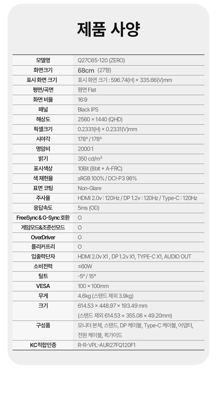 | 품명 및 모델명 | 모니터 / Q27C65-120 | KC 인증정보 | 본품: 유/KC마크, R-R-VPL-AUR27FQ120F1 |