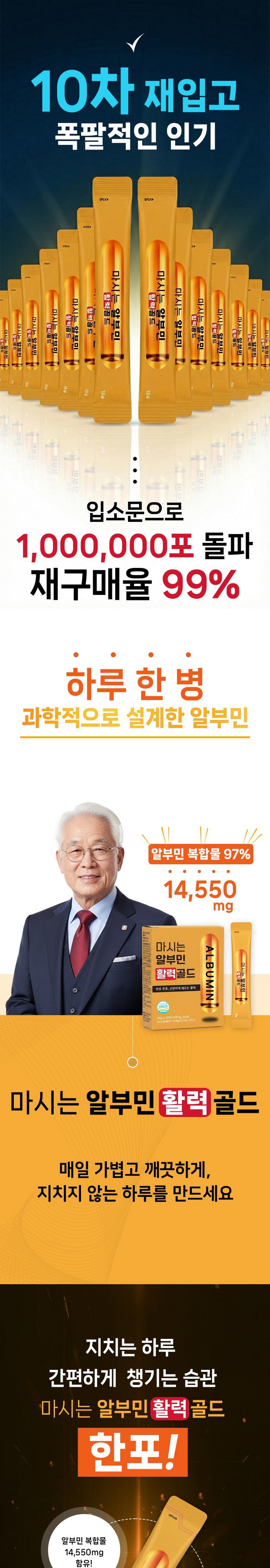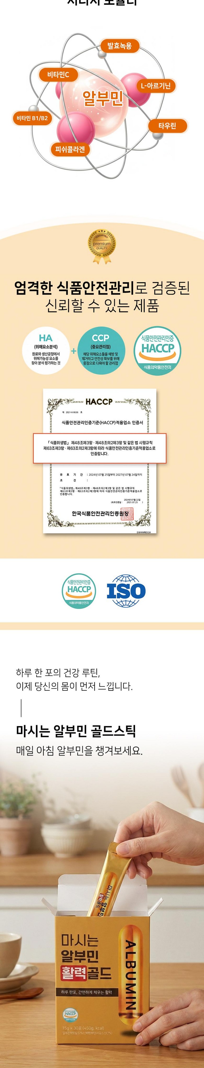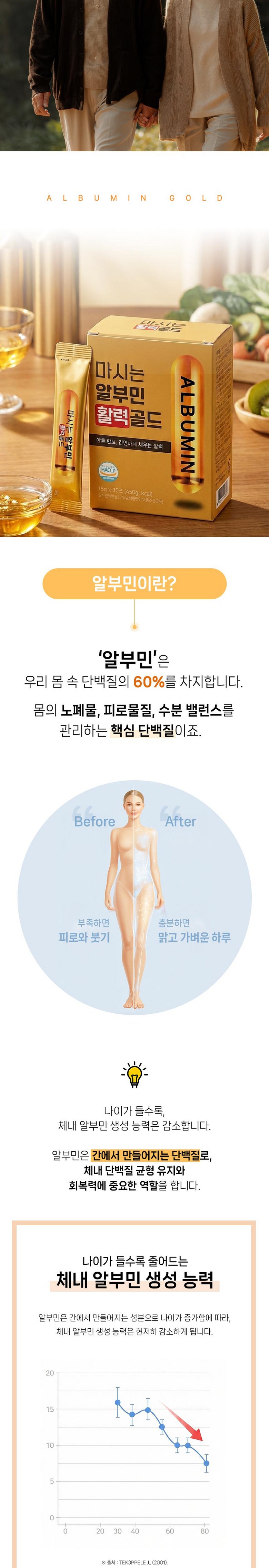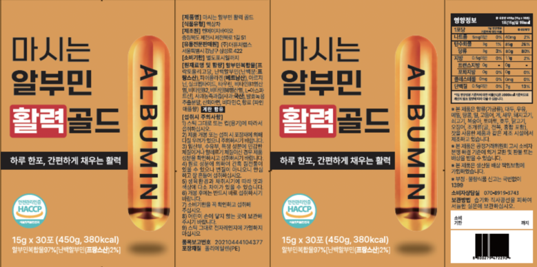 | 품목 또는 명칭 | 마시는 알부민 활력 골드 | 포장단위별 내용물의 용량(중량),수량,크기 | 15g X 30포 |