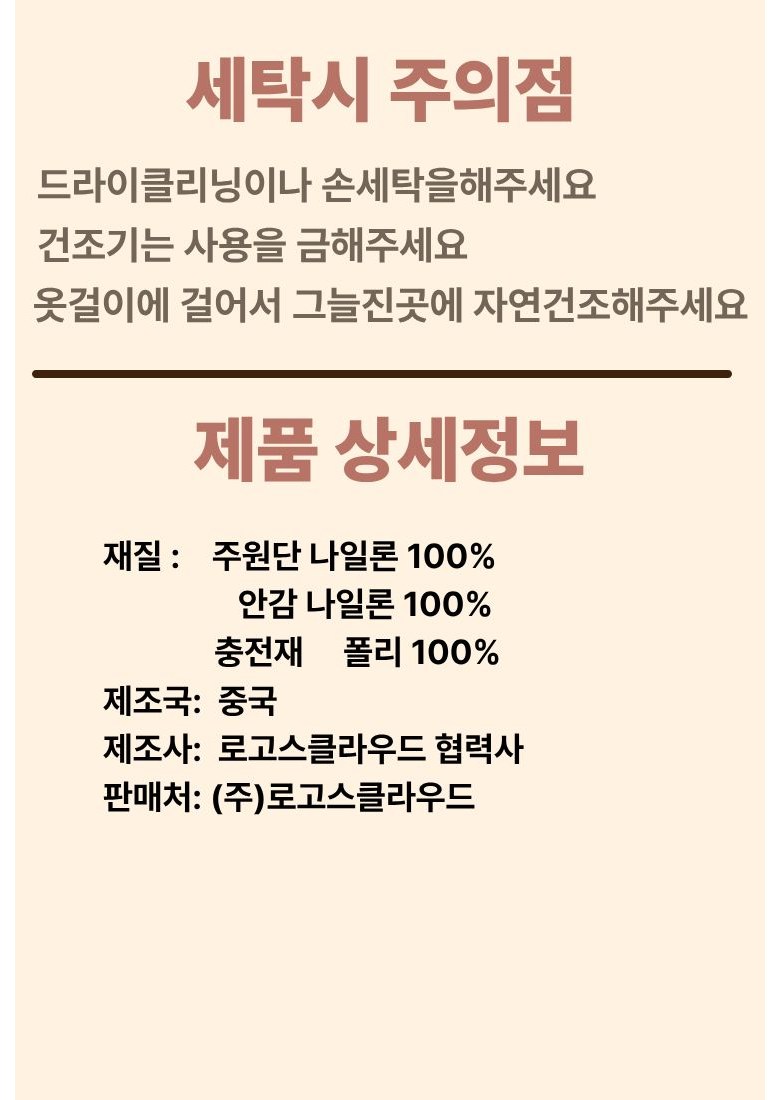 | 제조국 | 중국 | 세탁방법 및 취급시 주의사항 | 드라이클리닉 ,손세탁 |