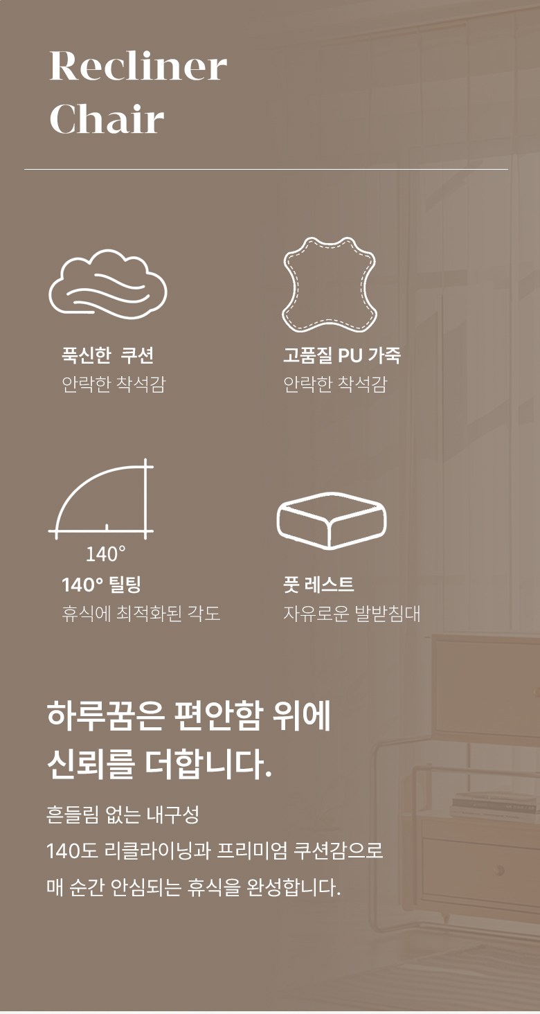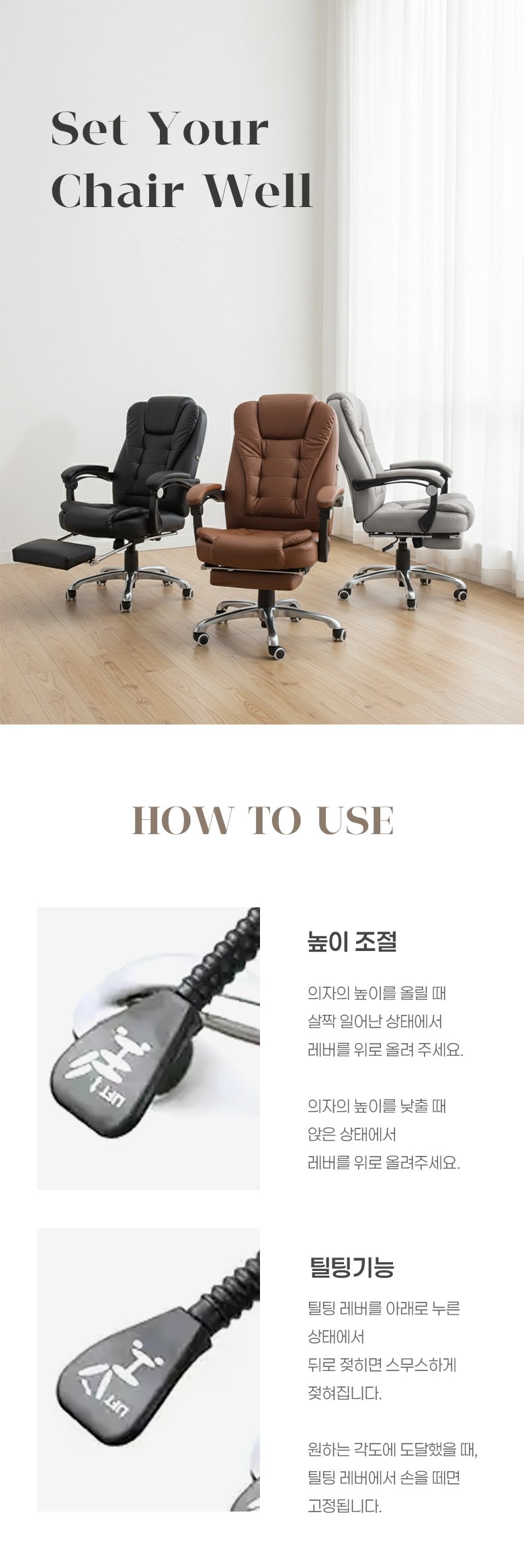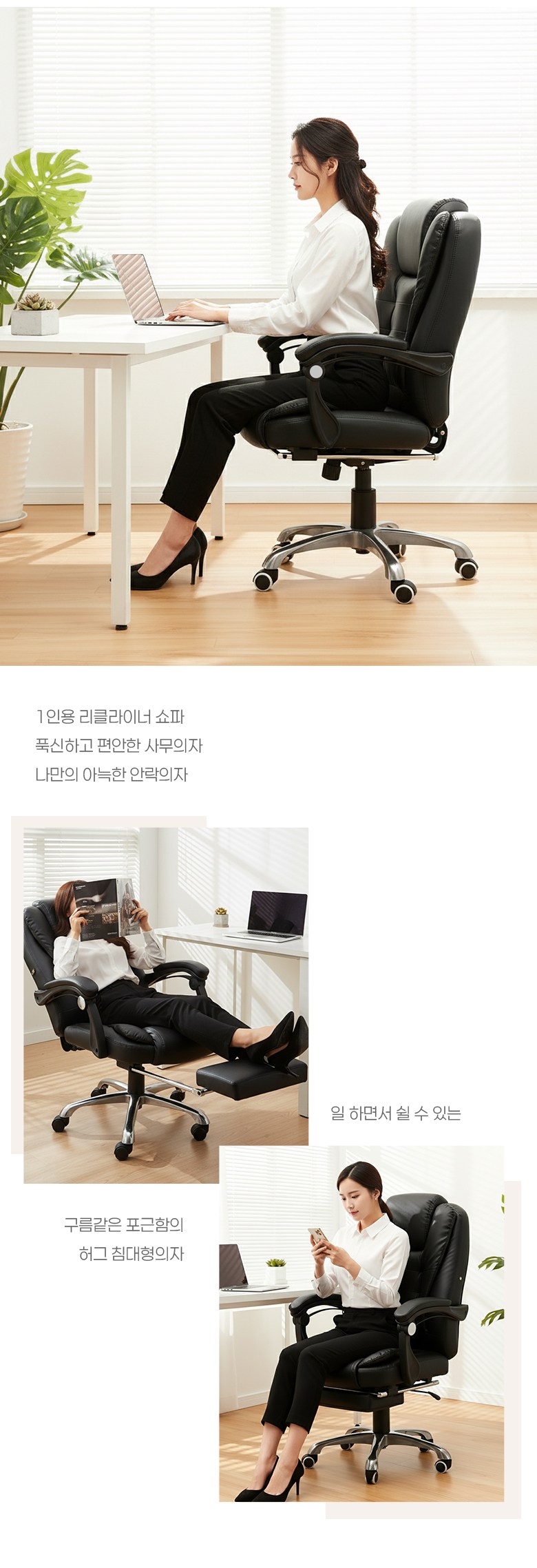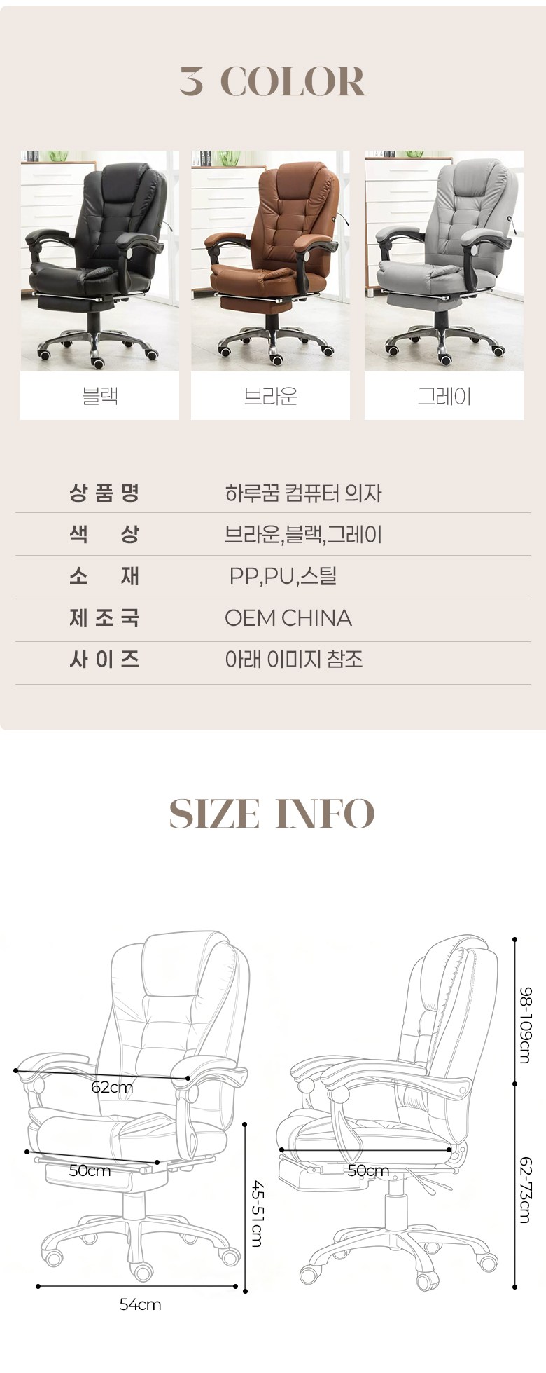 | 색상 | 1인용 리클라이너 의자 블랙/그레이/브라운 | 구성품 | 회장님의자 팔걸이/등받이/시트/5다리 받침대/바퀴/부품 |