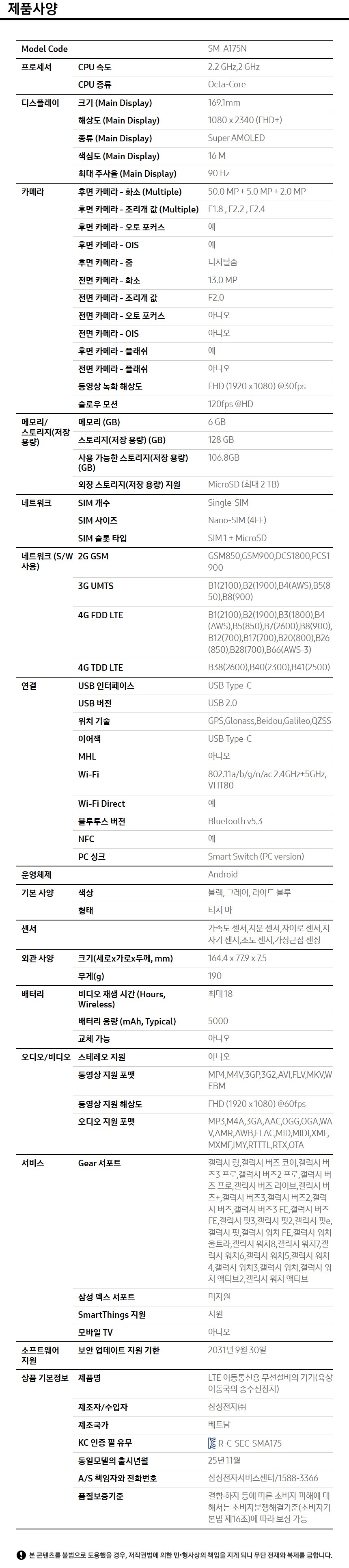 | 품명 및 모델명 | 휴대폰 / SM-A175N | KC 인증정보 | 유/KC마크 , R-C-SEC-SMA175 |