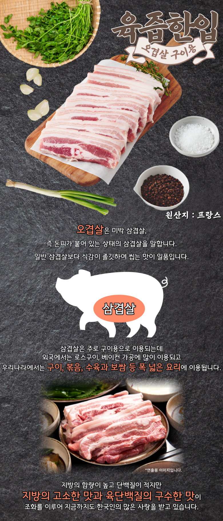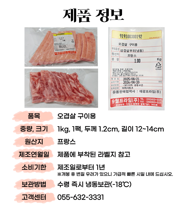 | 품목 또는 명칭 | 오겹살 | 포장단위별 내용물의 용량(중량),수량,크기 | 1kg 1팩 두께 1.2cm , 길이 12~14cm |